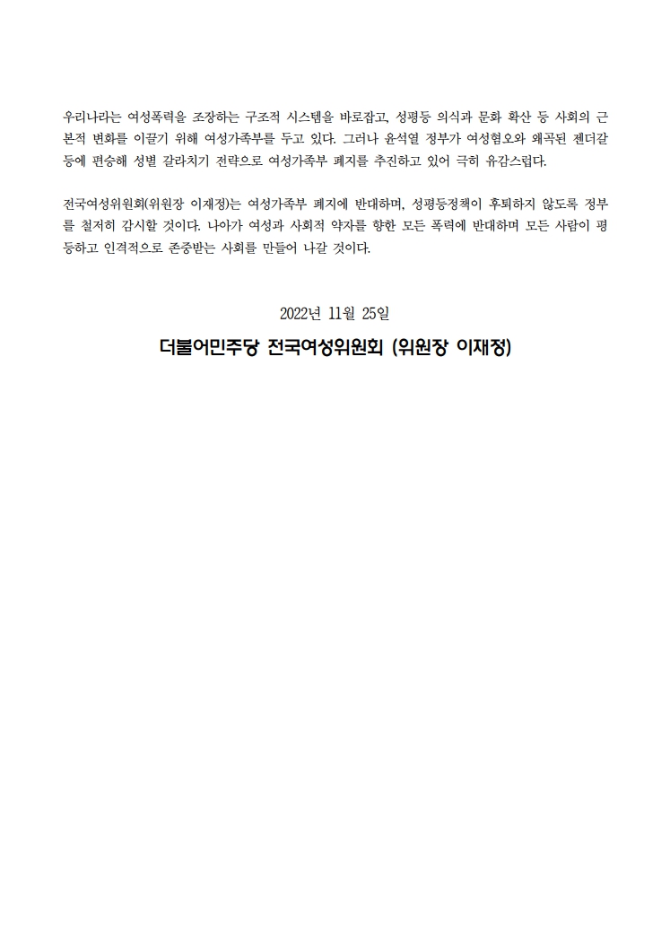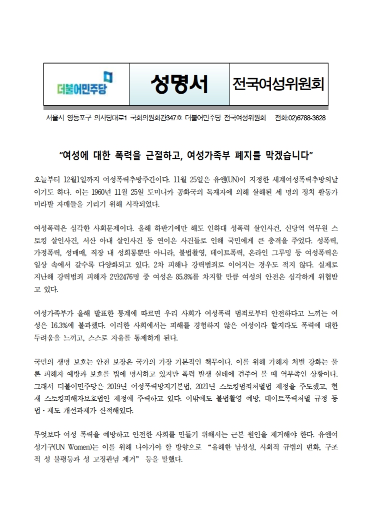 [성명서] 더불어민주당 전국여성위원회, 여성에 대한 폭력을 근절하고, 여성가족부 폐지를 막겠습니다