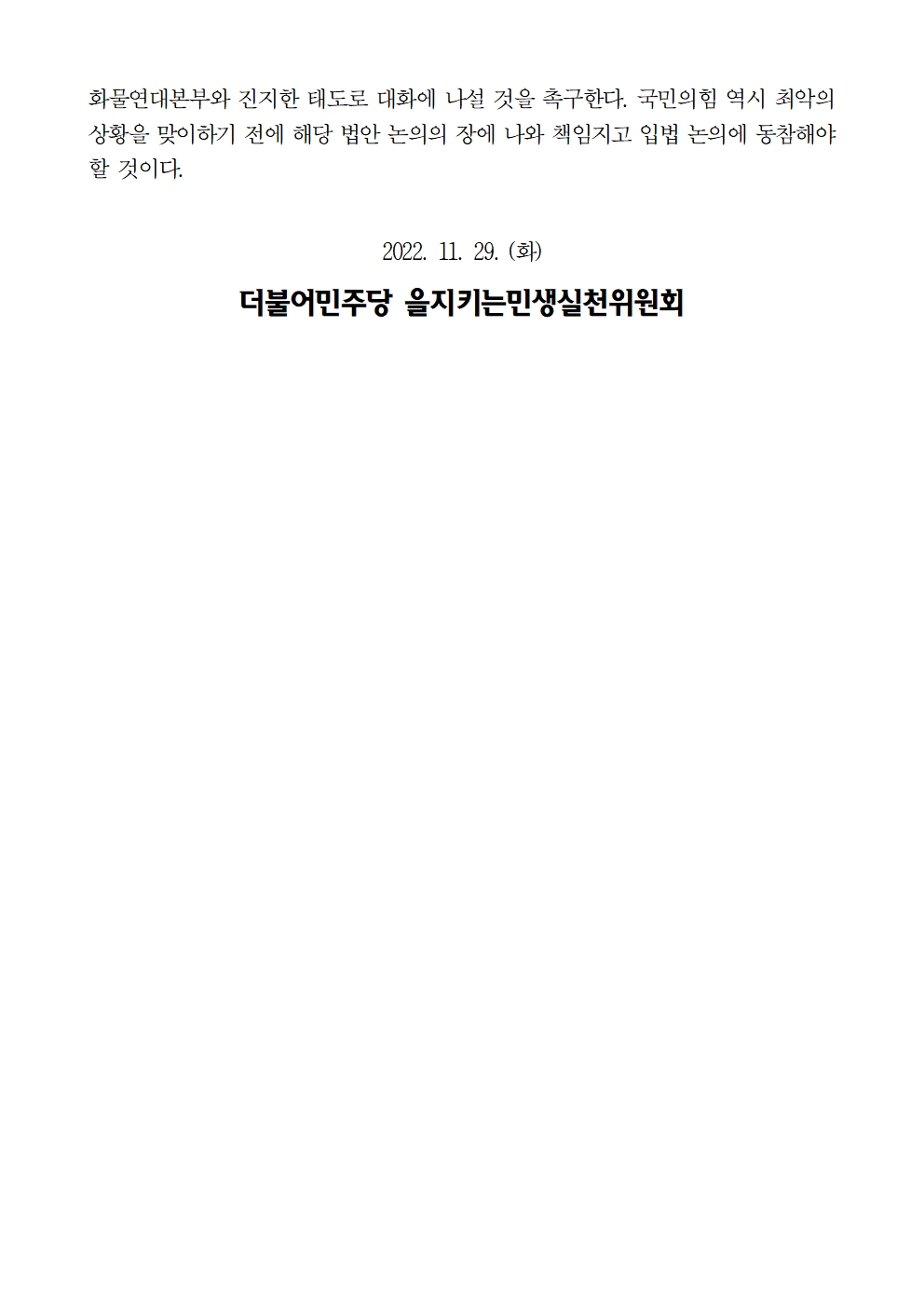 [성명서] 더불어민주당 을지키는민생실천위원회, 화물연대본부 총파업에 대한 윤석열 대통령의 업무개시명령을 규탄한다