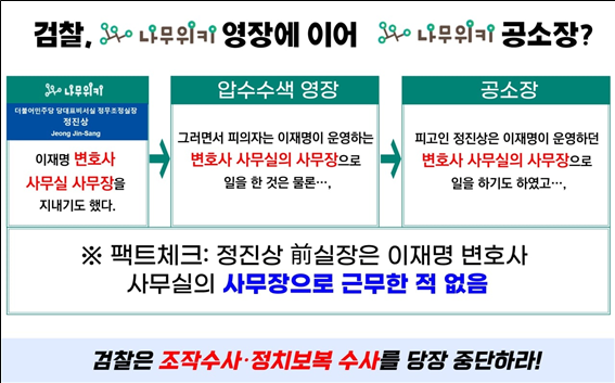 이는 지난 11월 검찰이 제시한 압수수색 영장에도 등장하는 허위 정보입니다정진상 실장은 이재명 변호사의 사무실에서 사무장으로 일한 적이 없습니다.