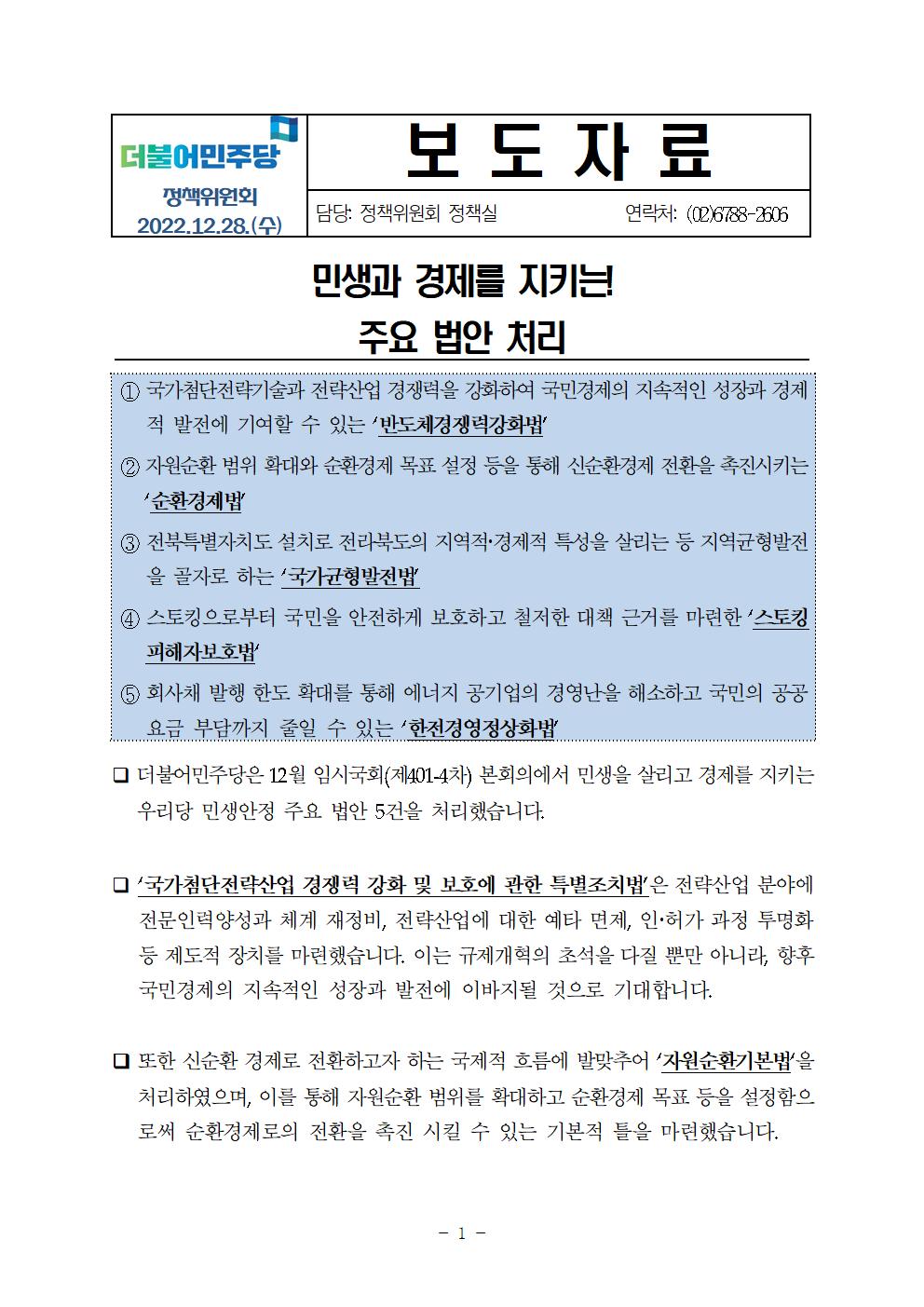 [보도자료] 더불어민주당 정책위원회, 민생과 경제를 지키는! 주요 법안 처리