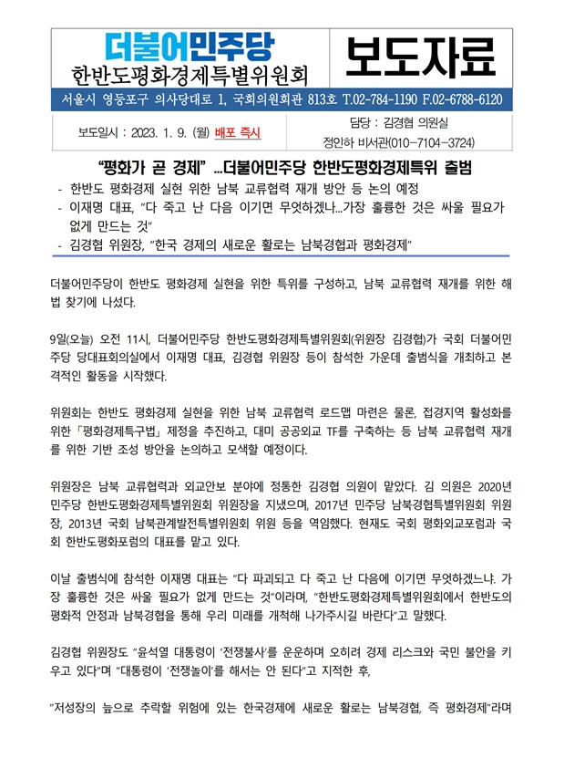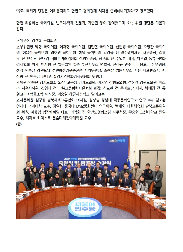 [보도자료] 더불어민주당 한반도평화경제특별위원회, “평화가 곧 경제” 출범식 개최