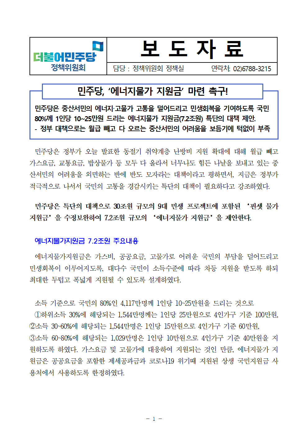 [보도자료] 더불어민주당 정책위원회, "민주당, '에너지물가 지원금' 마련 촉구!"