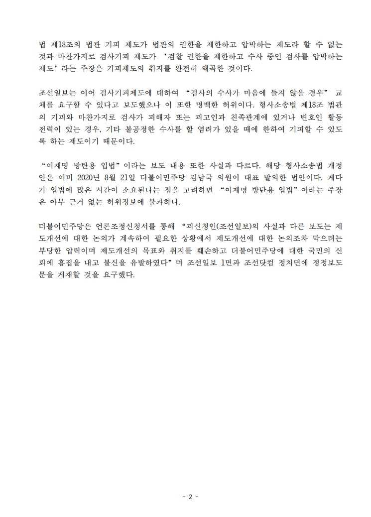[보도자료] 더불어민주당 검찰독재정치탄압대책위원회, '이재명 방탄용 입법' 조선일보 가짜뉴스에 정정보도 청구