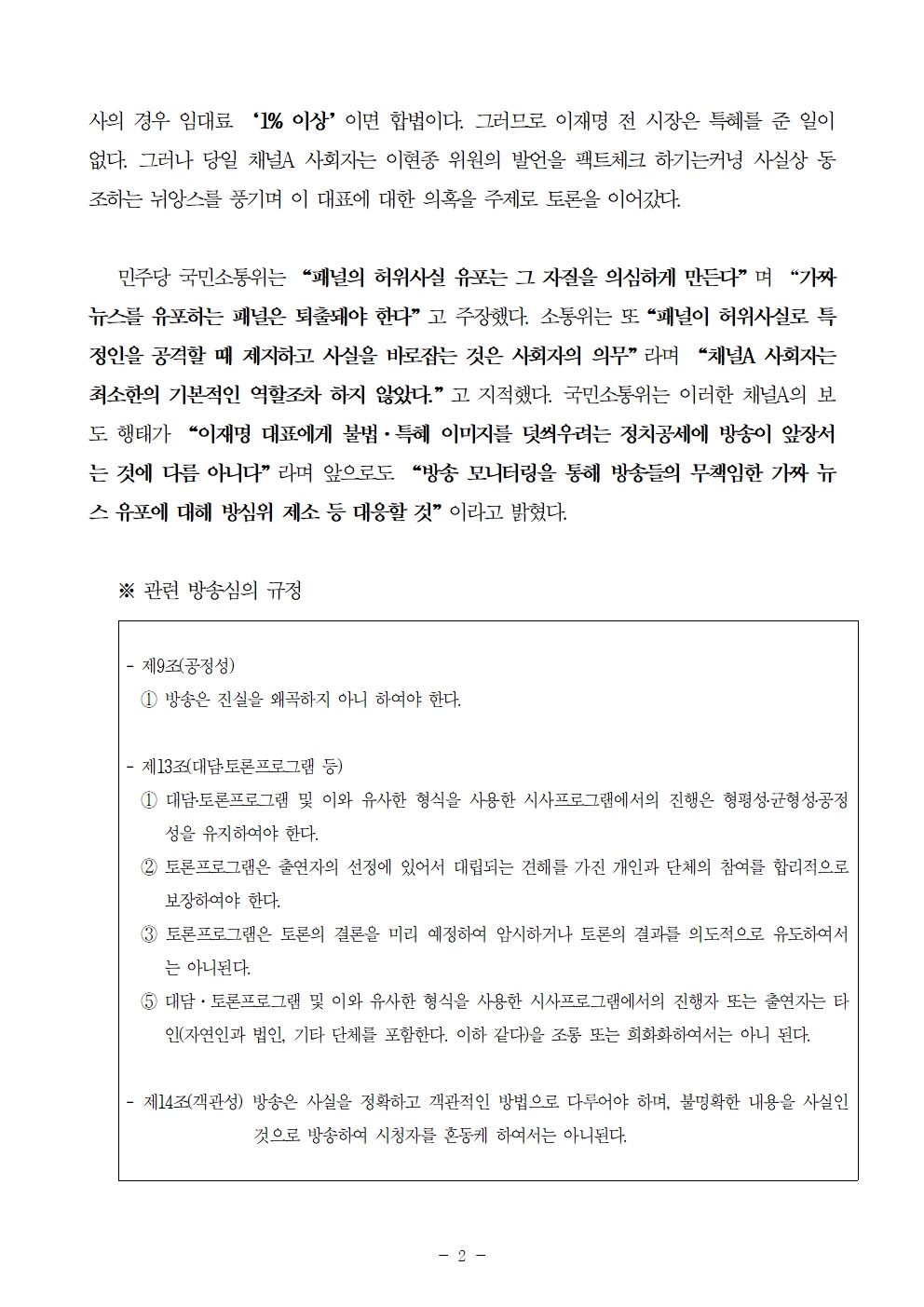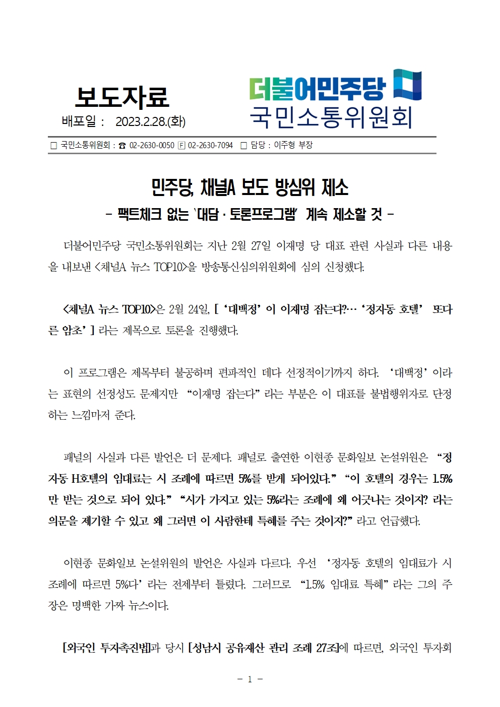 [보도자료] 더불어민주당 국민소통위원회, 채널A 보도 방심위 제소 - 팩트체크 없는 ‵대담·토론프로그램′계속 제소할 것 -