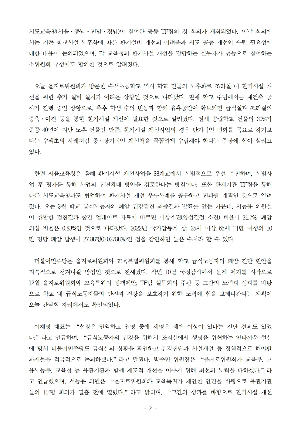 [보도자료] 더불어민주당 을지로위원회, 학교 급식노동자 폐암진단 관련 민생현장 방문