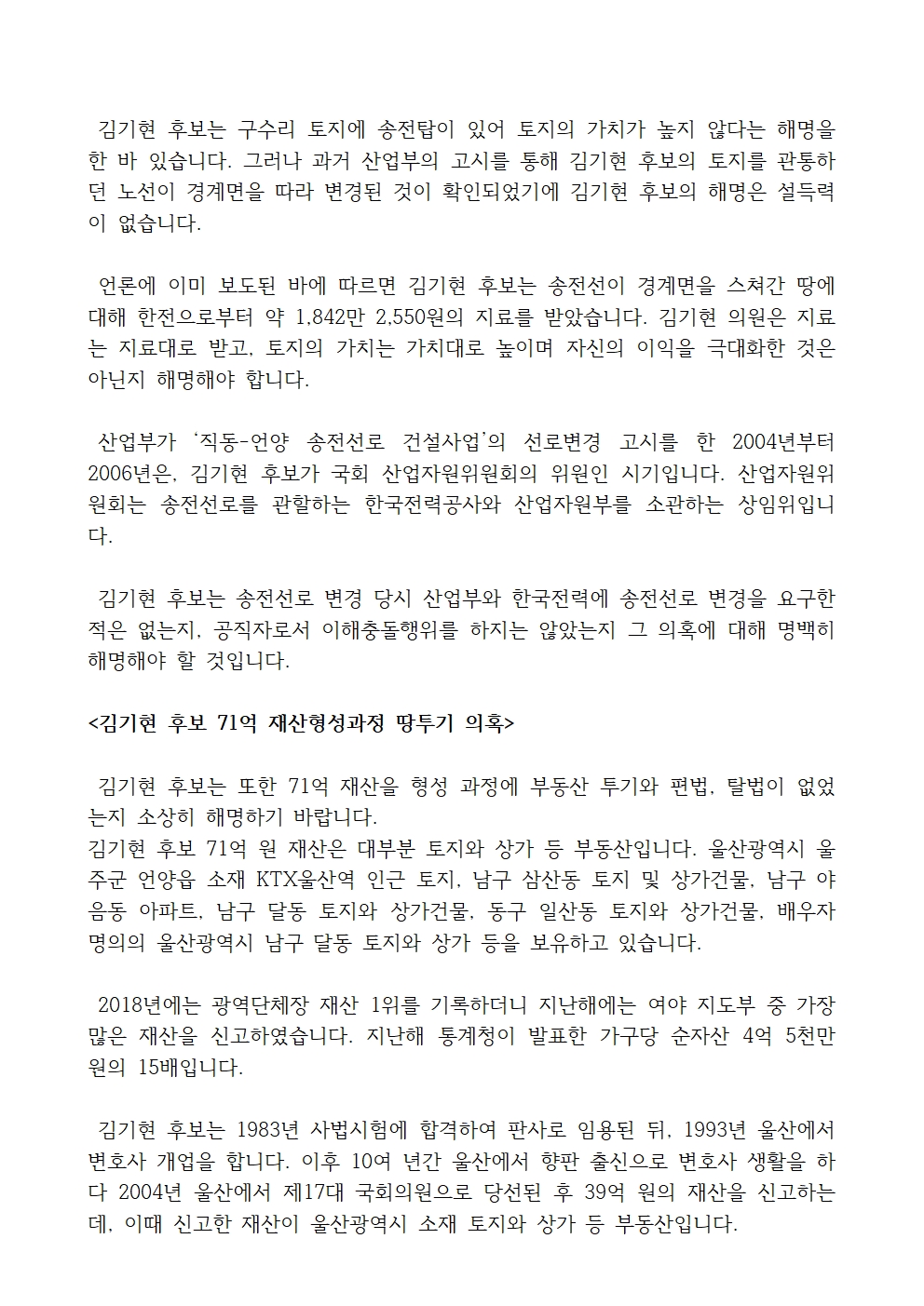 [기자회견문] 김기현 의원 땅투기 및 토착·토건비리 의혹 진상조사 TF, 울산 KTX 역세권 땅 송전선로 휘어진 과정, 향판출신 변호사로 71억 재산형성 과정 해명하라!