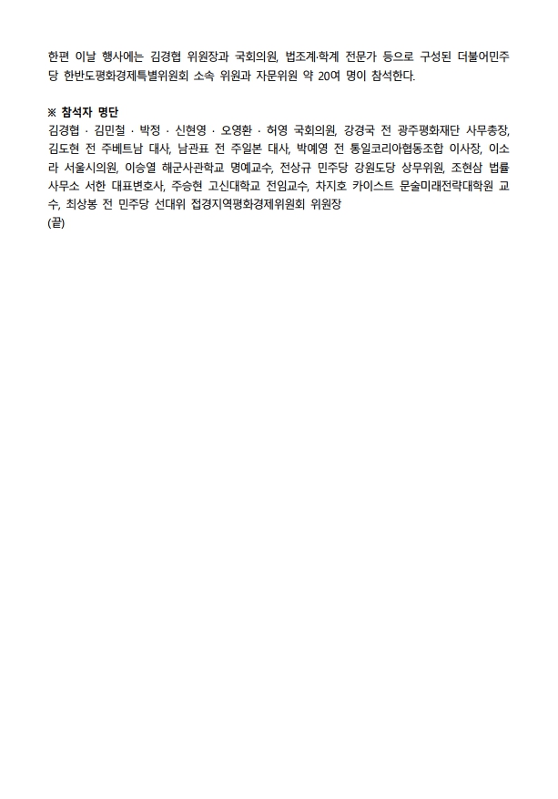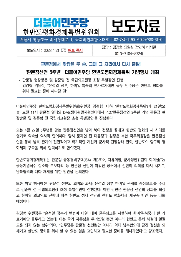 [보도자료] 더불어민주당 한반도평화경제특별위원회, '판문점선언 5주년' 더불어민주당 한반도평화경제특위 기념행사 개최