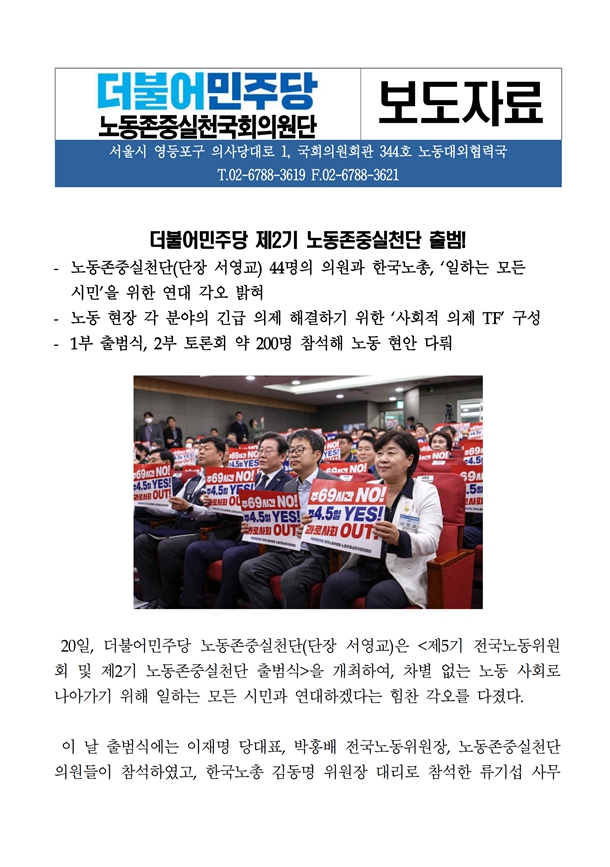 [보도자료] 더불어민주당 노동존중실천국회의원단, 더불어민주당 제2기 노동존중실천단 출범