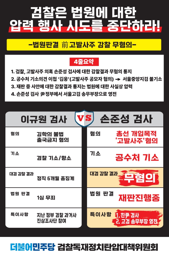 [입장문] 더불어민주당 검찰독재정치탄압대책위원회,법원 판결 前 ‘고발사주’감찰 무혐의 · 공모자 불기소-검찰은 법원에 압력을 행사하려는 시도를 중단하십시오.