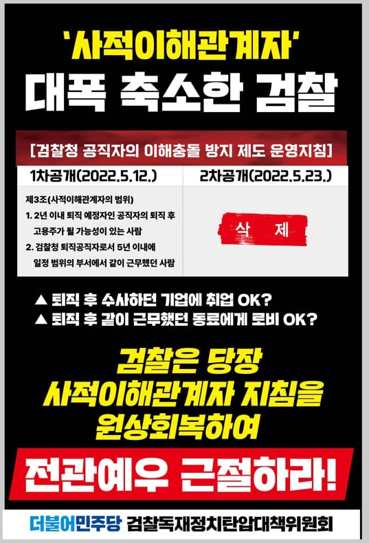 2022년 5월 12일 대검찰청이 홈페이지에 공개한 내용에 따르면 ‘검찰청 공직자의 이해충돌 방지 제도 운영지침’3조의 사적 이해관계자의 범위에는 ‘2년 이내 퇴직 예정인 공직자의 퇴직 후 고용주가 될 가능성이 있는 사람’이 포함될 예정이었습니다.