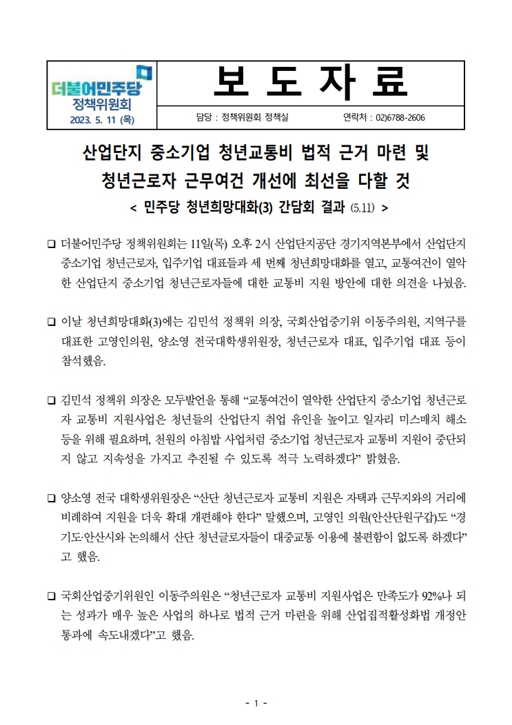 [보도자료] 더불어민주당 정책위원회, 산업단지 중소기업 청년교통비 법적 근거 마련 및 청년근로자 근무여건 개선에 최선을 다할 것