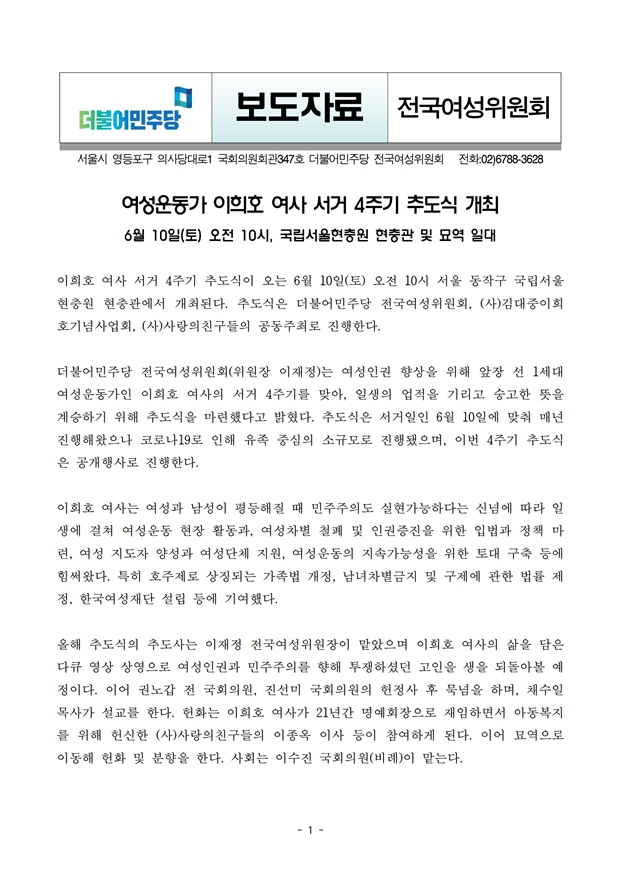 [보도자료] 더불어민주당 전국여성위원회, 여성운동가 이희호 여사 서거 4주기 추도식 개최