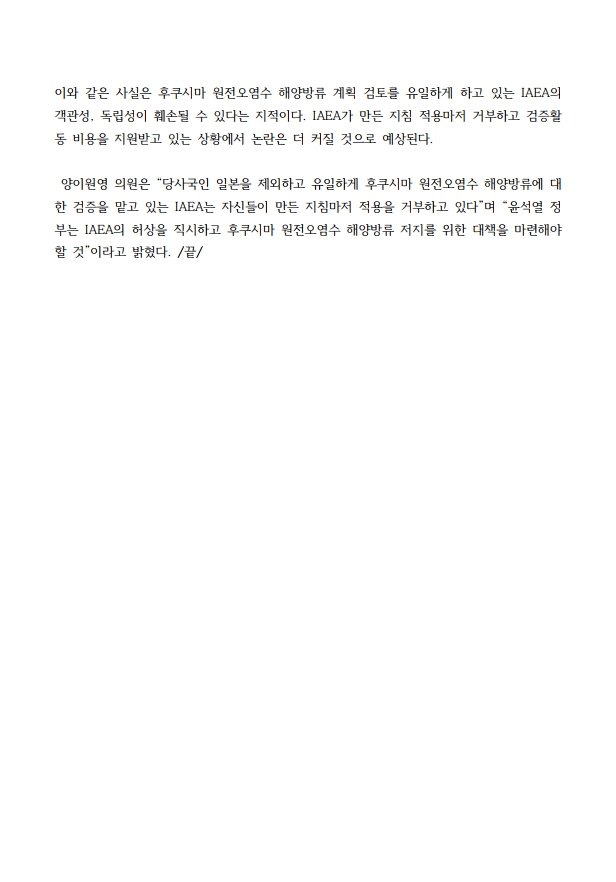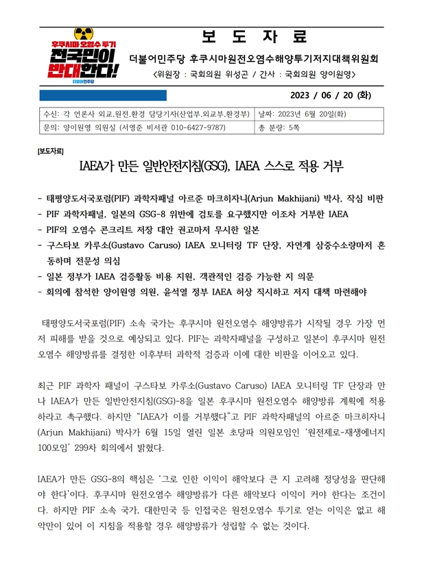 [보도자료] 더불어민주당 후쿠시마원전오염수해양투기저지대책위원회, IAEA가 만든 일반안전지침(GSG), IAEA 스스로 적용 거부