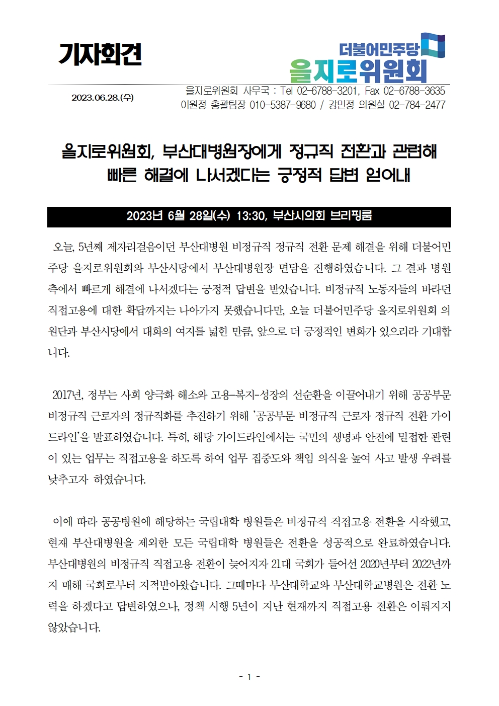 [기자회견문] 더불어민주당 을지로위원회ㆍ부산시당, 부산대병원장에게 정규직 전환과 관련해 빠른 해결에 나서겠다는 긍정적 답변 얻어내
