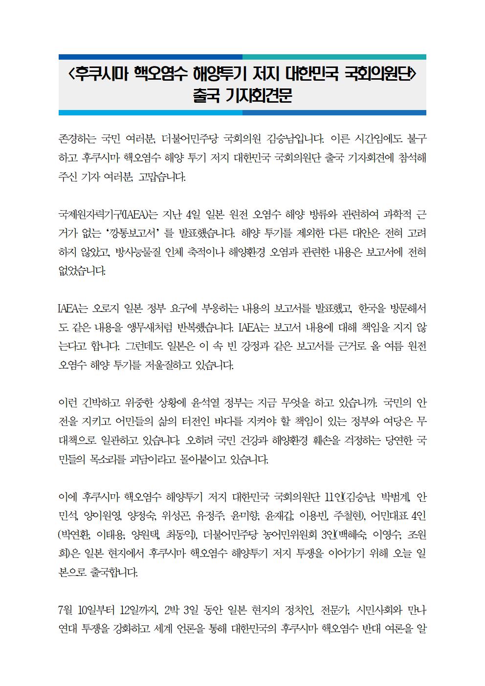 [보도자료]후쿠시마 핵오염수 해양투기 저지 대한민국 국회의원단 방일
