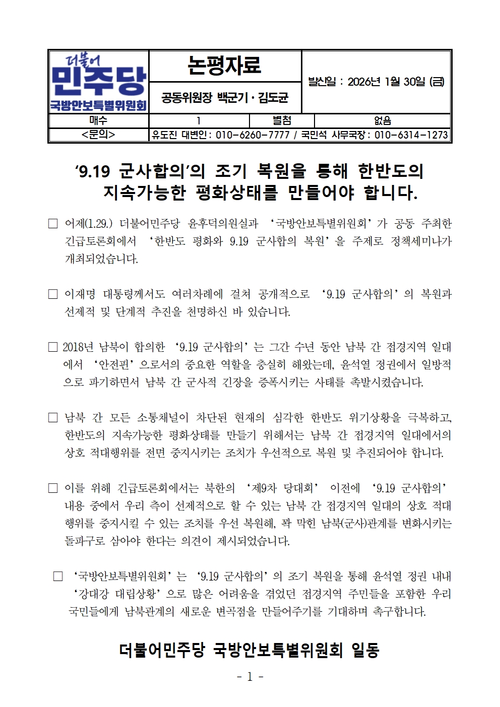 260130더불어민주당_국방안보특별위원회_‘9_19_군사합의’의_조기_복원을_통해_한반도의_지속가능한_평화상태를_만들어야 합니다.hwp
