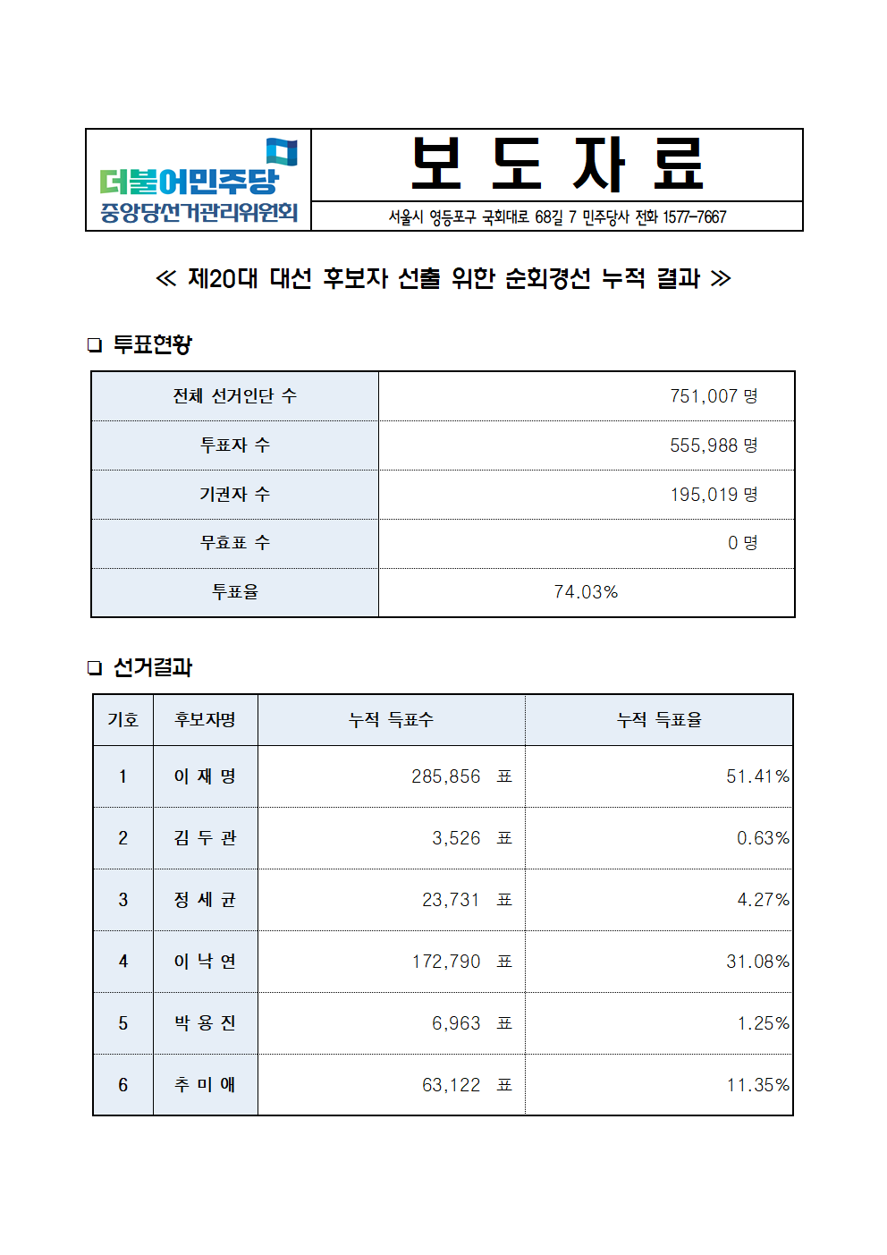 [보도자료] 제20대 대선 후보자 선출 위한 순회경선 누적 결과 보도자료