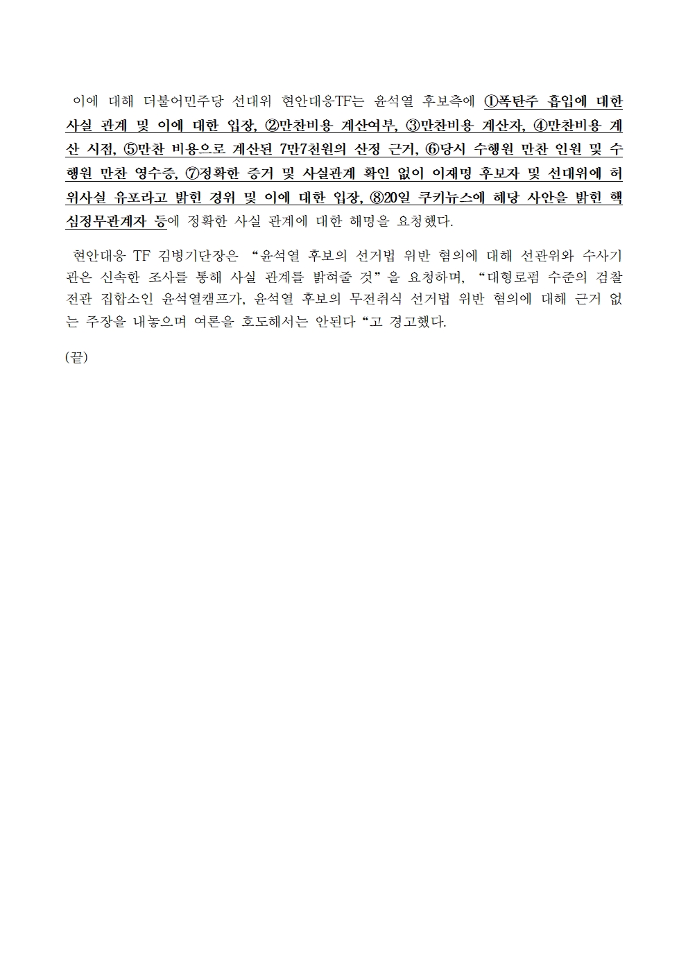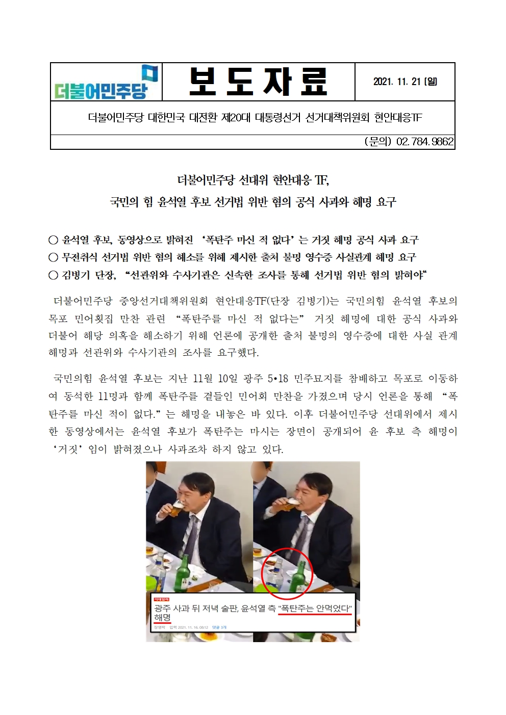 [보도자료] 더불어민주당 선대위 현안대응 TF, 국민의힘 윤석열 후보 선거법 위반 혐의 공식 사과와 해명 요구