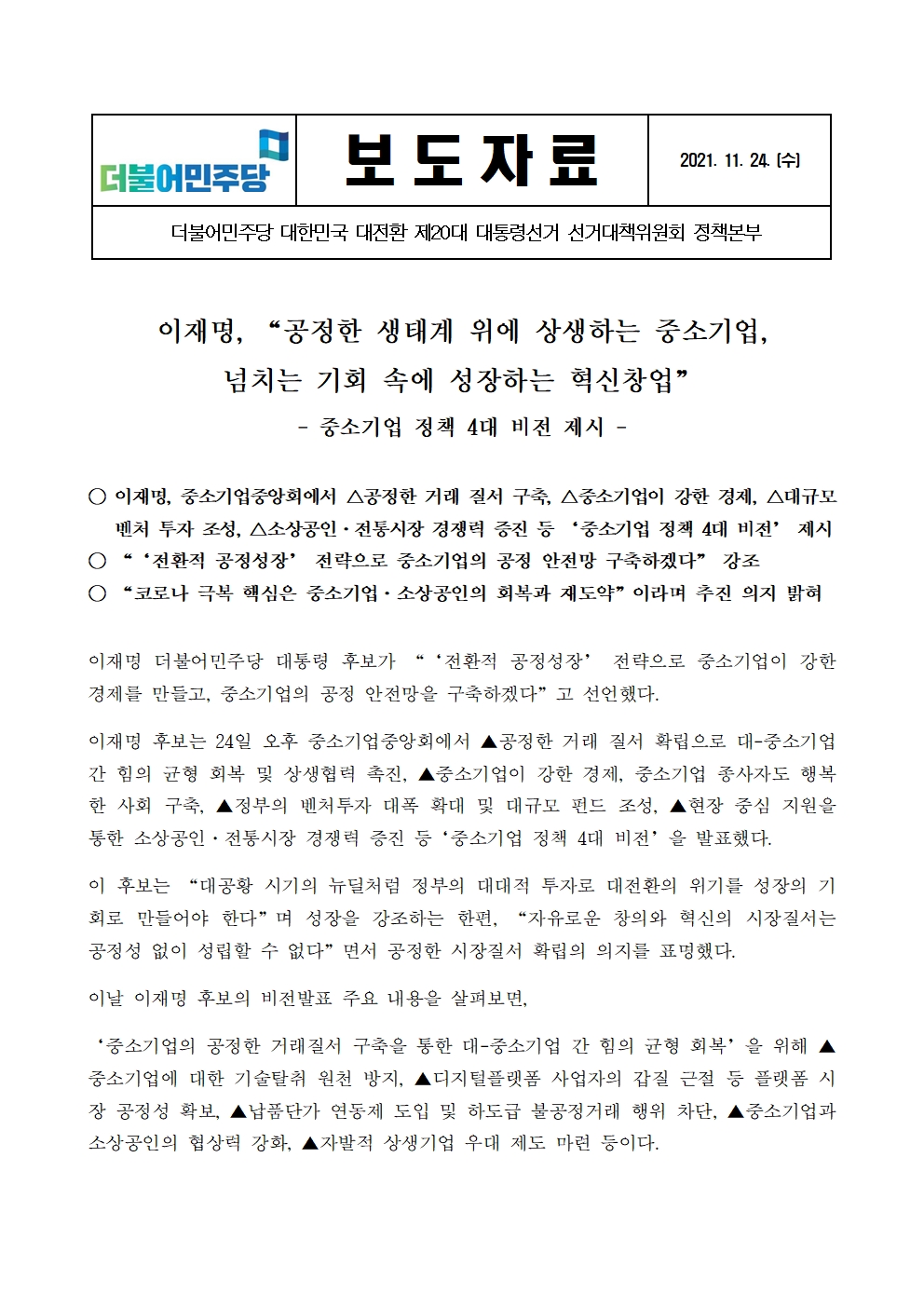 [보도자료] 이재명, “공정한 생태계 위에 상생하는 중소기업, 넘치는 기회 속에 성장하는 혁신창업” 중소기업 정책 4대 비전 제시