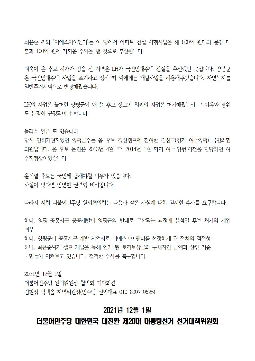 [기자회견문] 더불어민주당 원외위원장 협의회, 윤석열 처가 양평 공흥지구 개발 특혜의혹 양평현장 방문