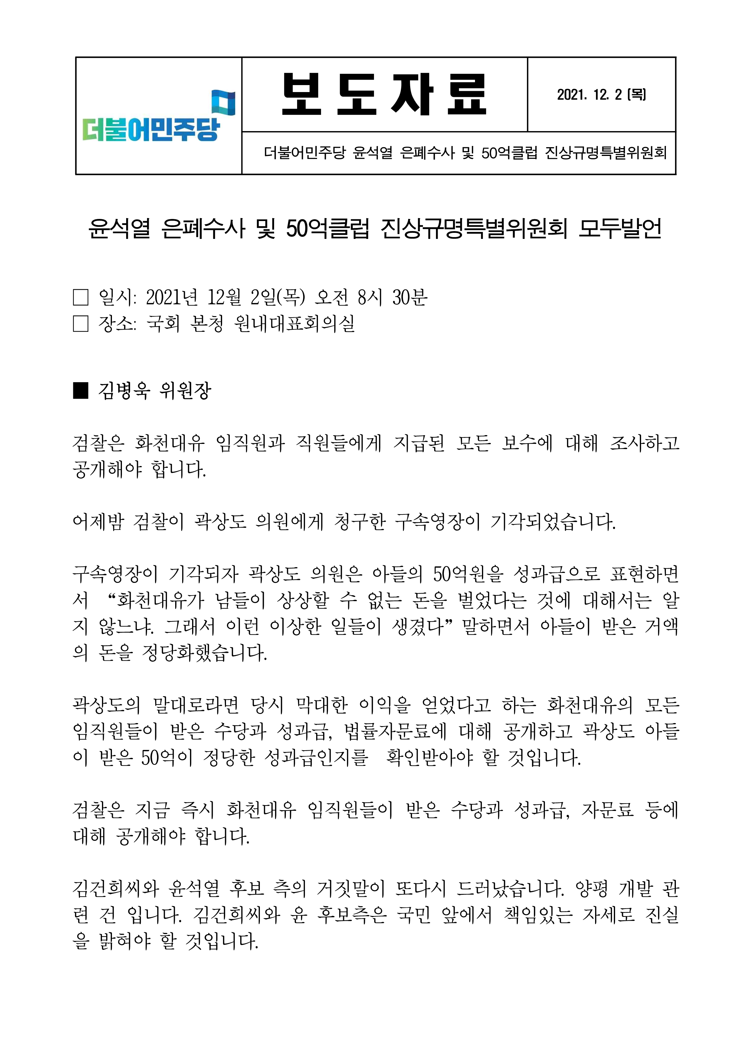 [보도자료] 더불어민주당 윤석열 은폐수사 및 50억클럽 진상규명특별위원회 모두발언