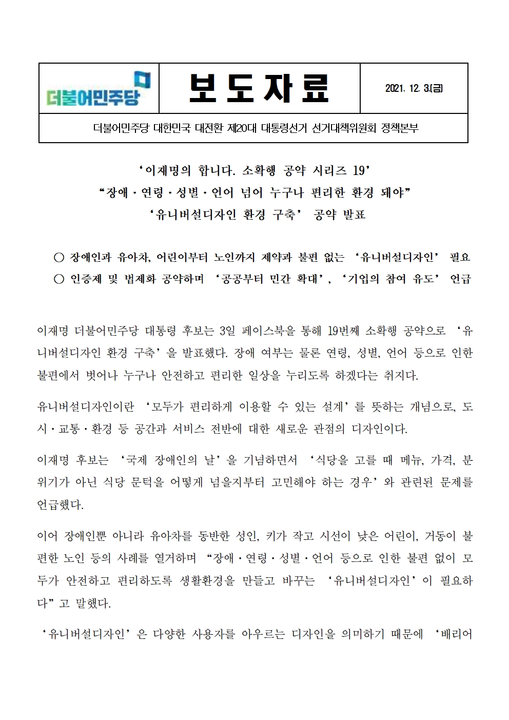 [보도자료] 더불어민주당 선대위 정책본부, '이재명의 합니다. 소확행 공약 시리즈 19' 유니버셜디자인 환경구축