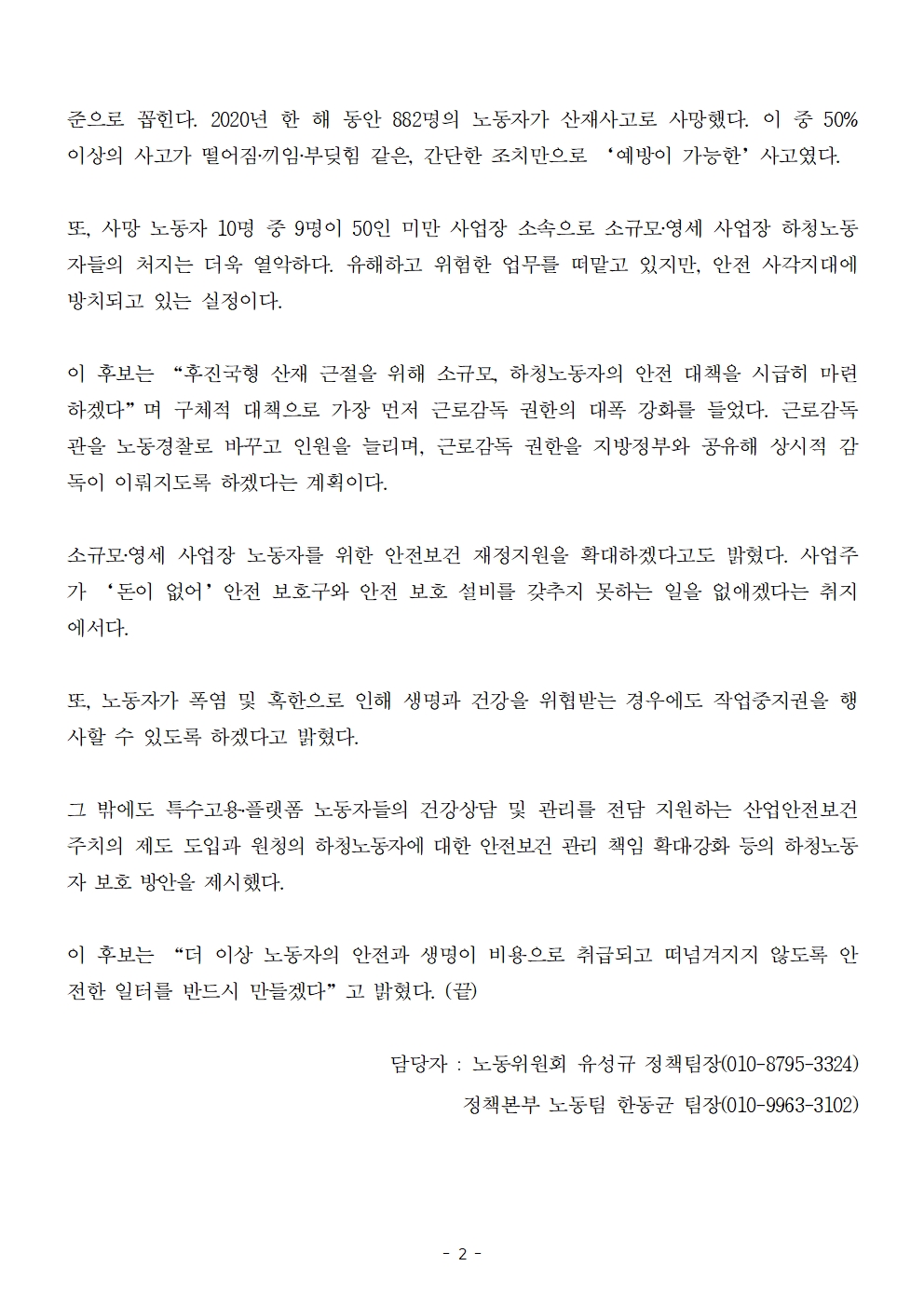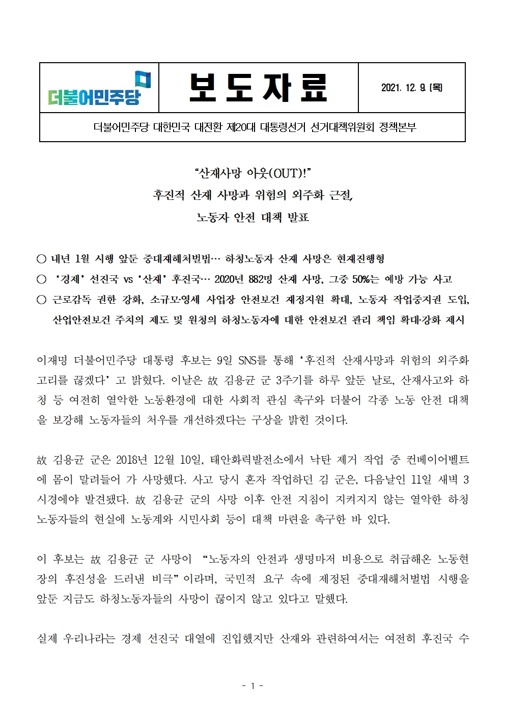 [보도자료] 더불어민주당 선대위 정책본부, 후진적 산재 사망과 위험의 외주화 근절, 노동자 안전 대책 발표