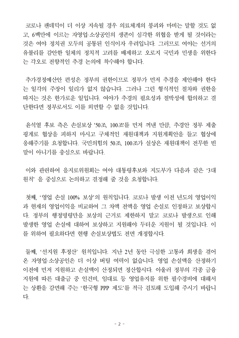 [보도자료] 더불어민주당 선대위 을지로위원회, 코로나 손실보상 100조, 여야의 신속한 추경 협상 촉구 기자회견