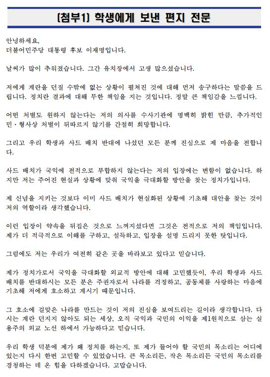 [보도자료] 더불어민주당 선대위, 이재명 후보, 계란 투척 고등학생에 편지 보내