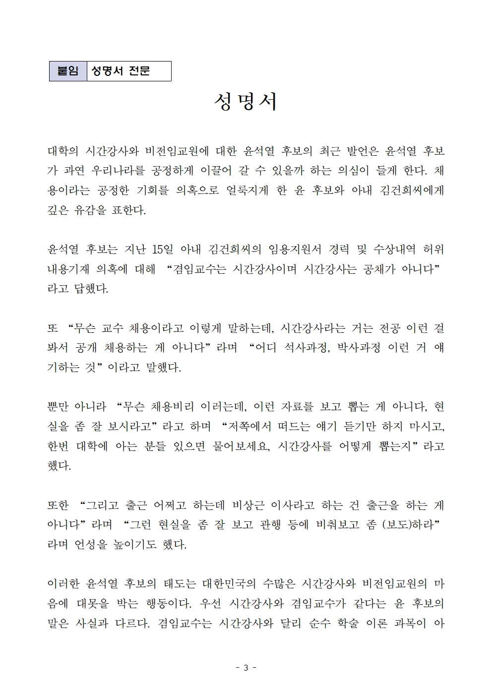 [보도자료] 더불어민주당 선대위 기본사회위원회, 윤석열 후보 시간강사 발언 규탄 성명 발표