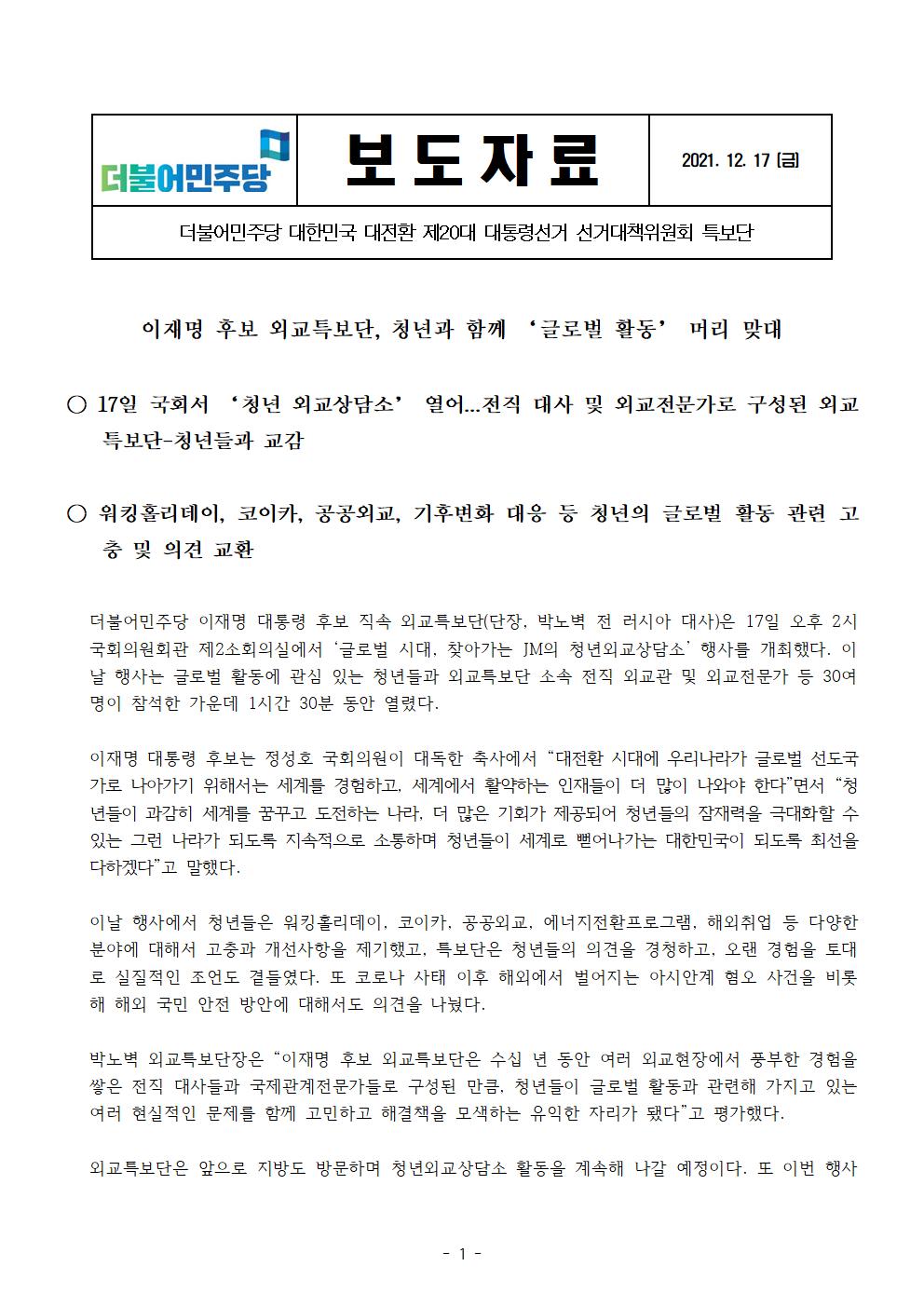 [보도자료] 더불어민주당 선대위 특보단_외교특보단 청년과의 대화
