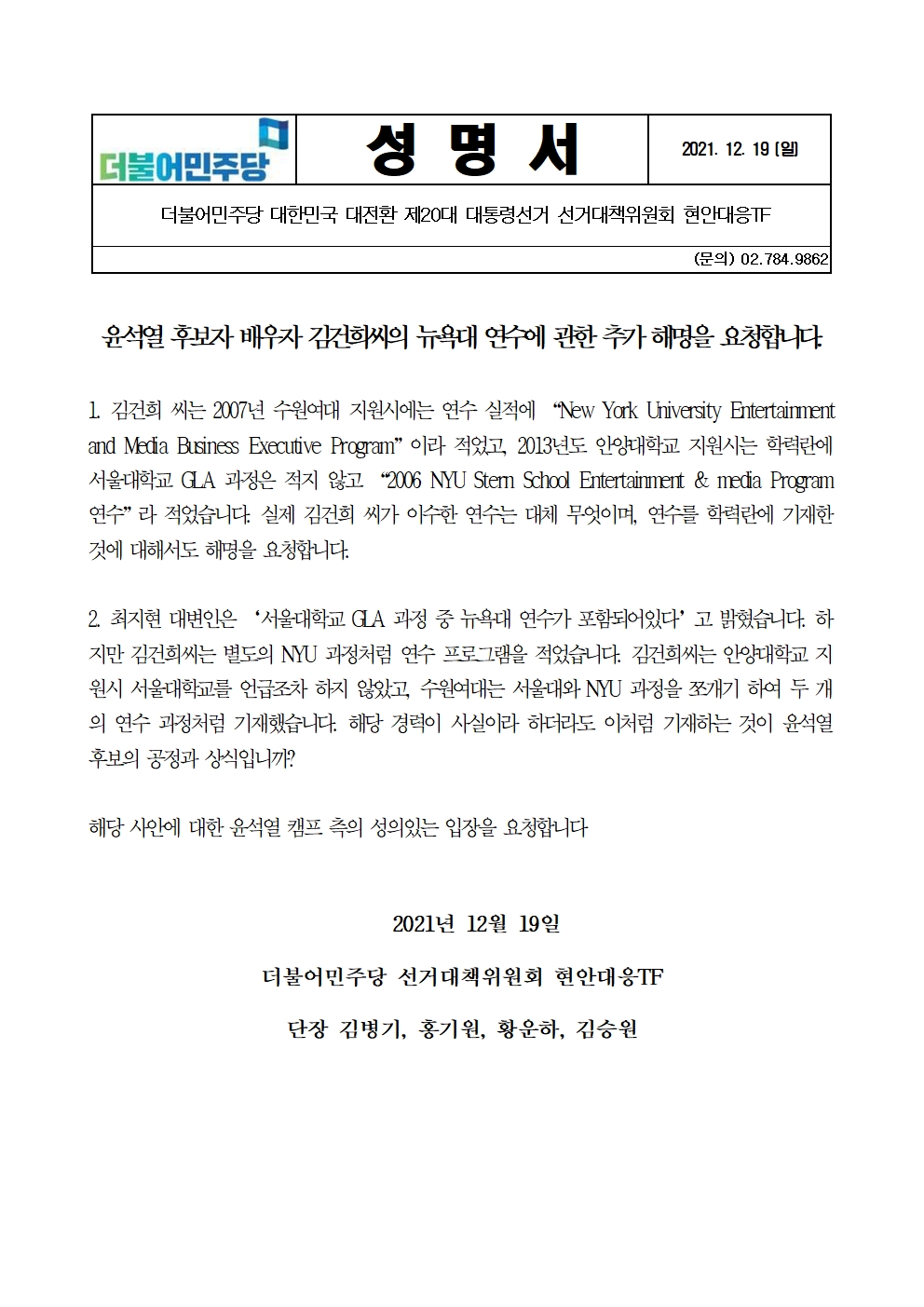 [성명서] 더불어민주당 선대위 현안대응 TF, 윤석열 후보 배우자 김건희씨의 뉴욕대 연수에 관한 추가 해명을 요청합니다