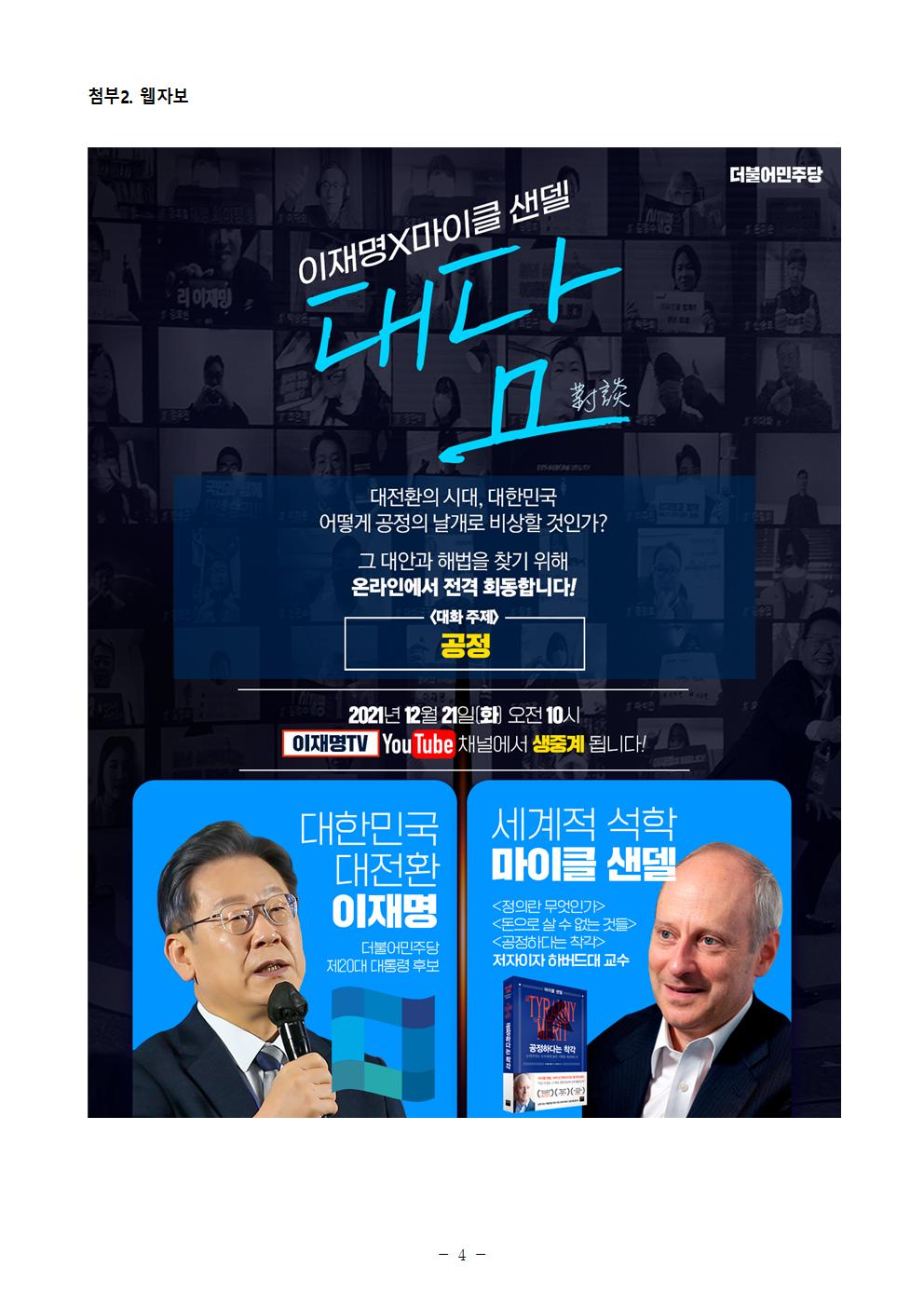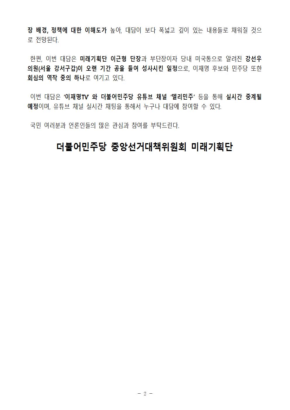 [보도자료] 더불어민주당 선대위 미래기획단, 이재명 후보 마이클 샌델 대담