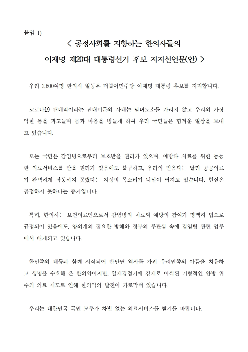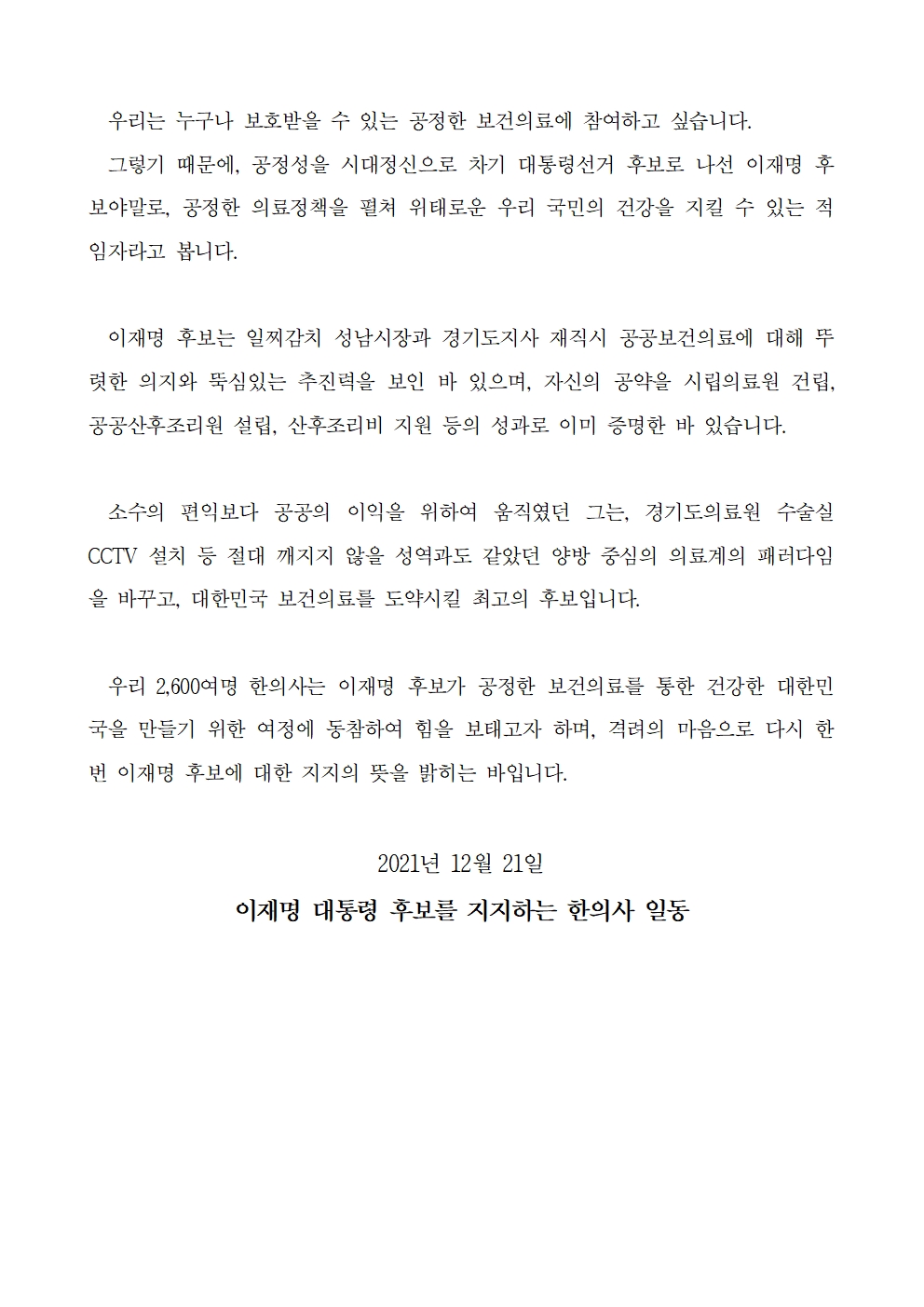 [보도자료] 한의사 2,600여명 이재명 후보 지지선언