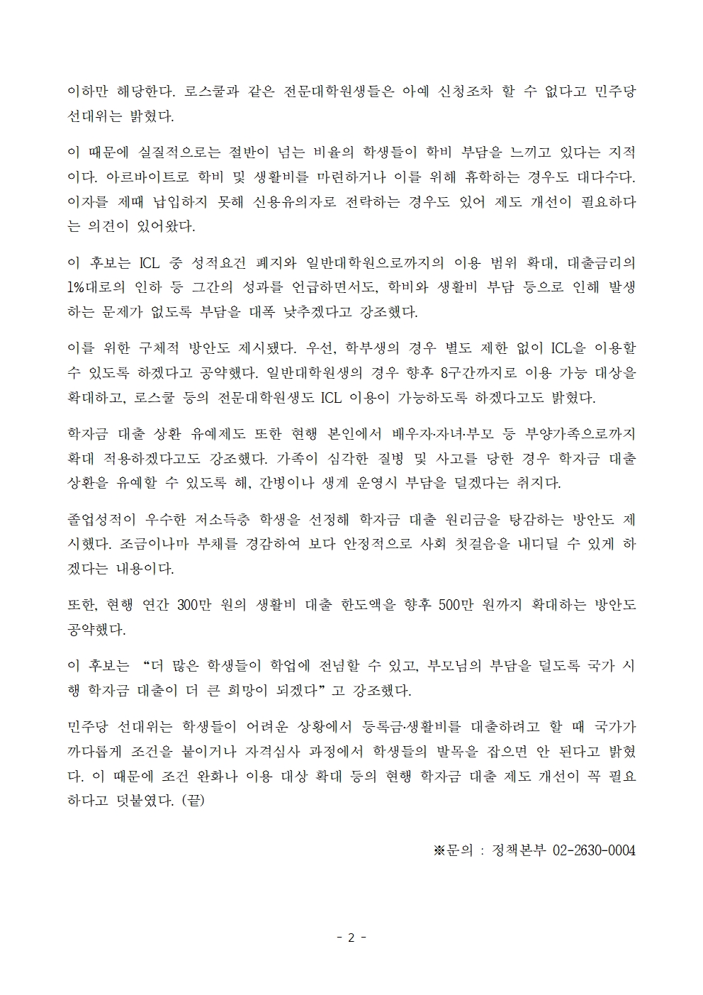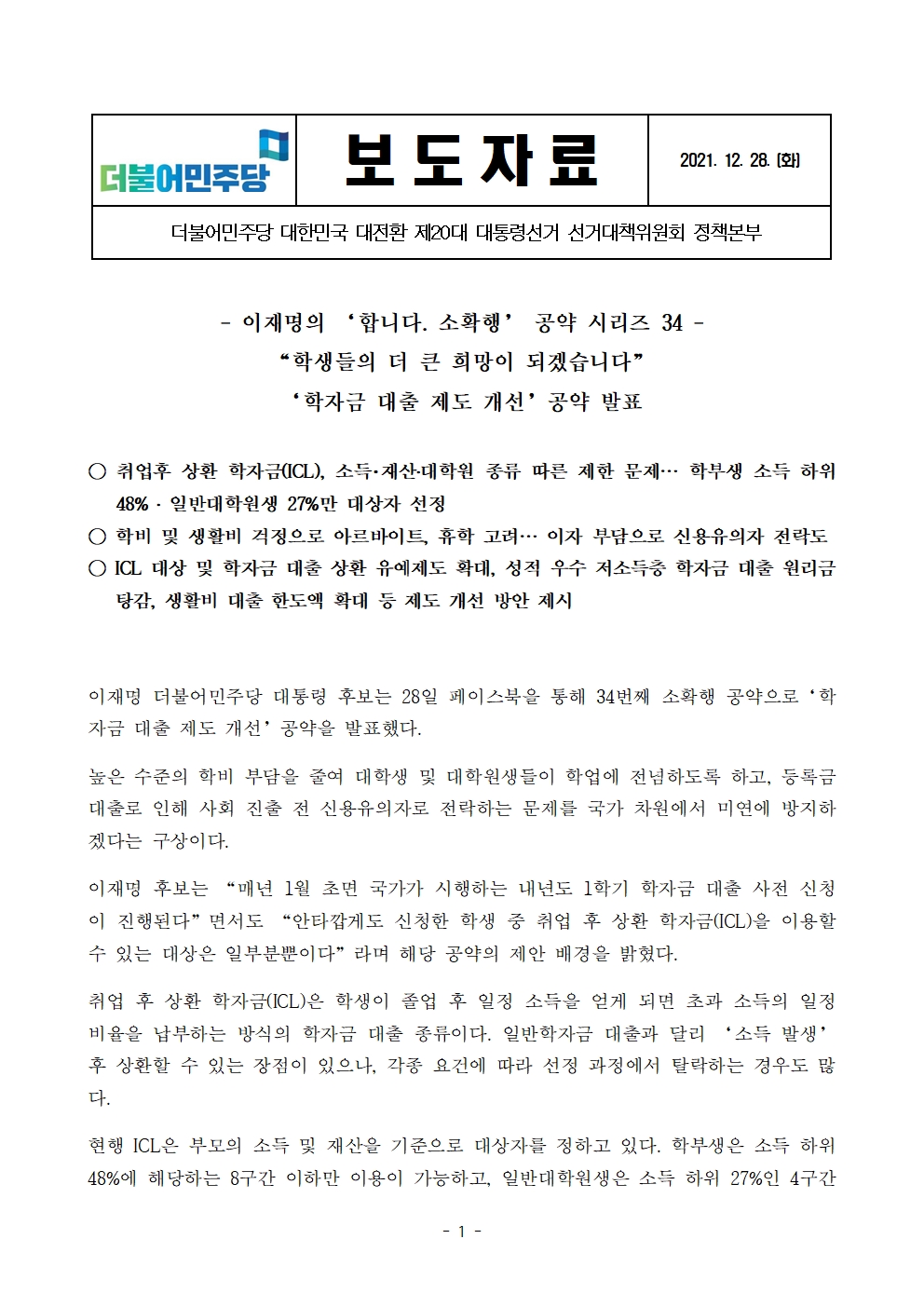 [보도자료] 더불어민주당 선대위 정책본부, '이재명의 합니다. 소확행 공약 시리즈 34' 학자금 대출 제도 개선 공약