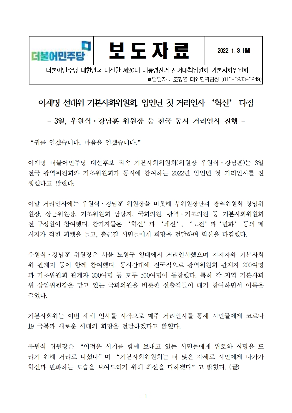[보도자료] 더불어민주당 선대위 기본사회위원회, 임인년 첫 거리인사 '혁신' 다짐