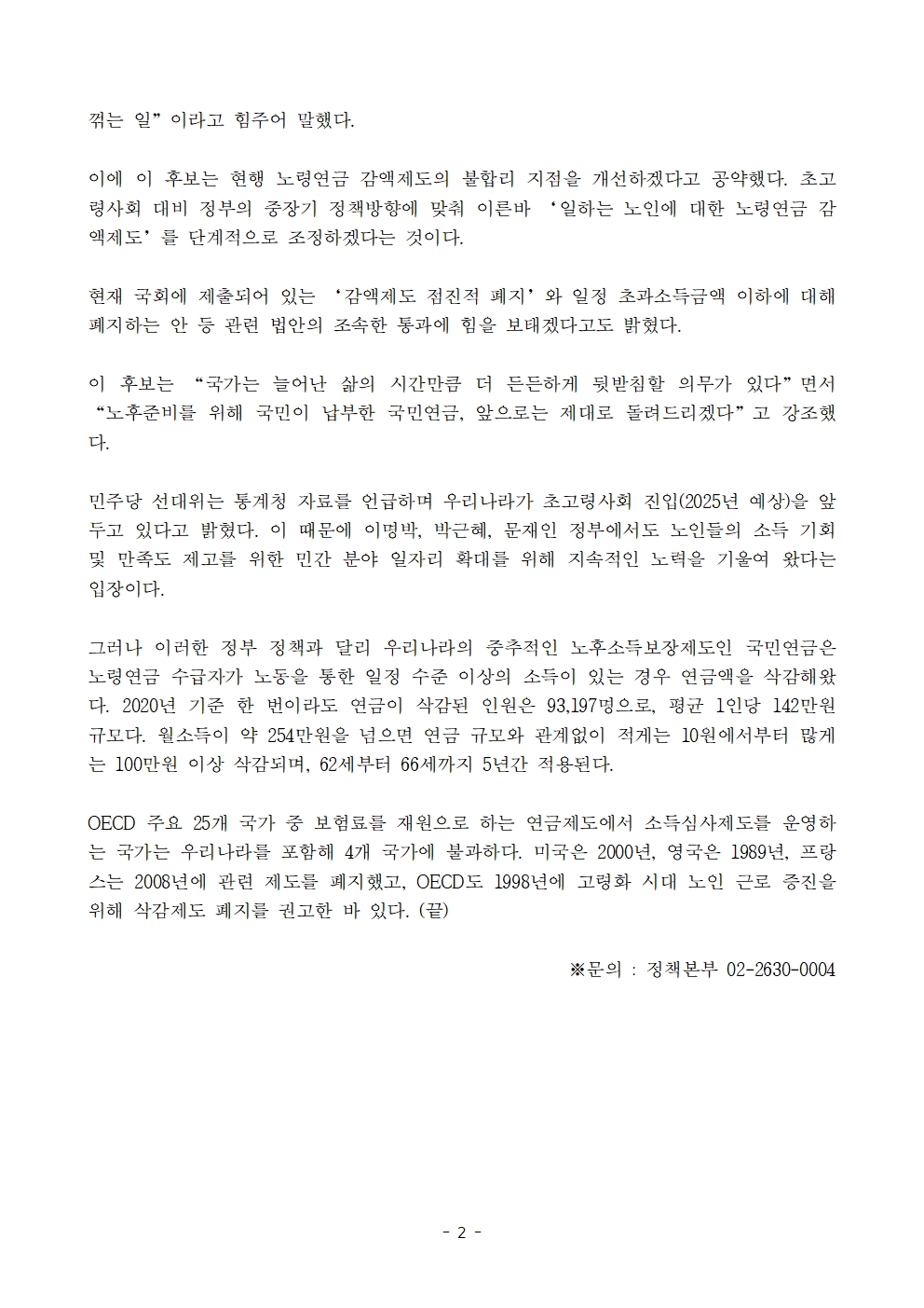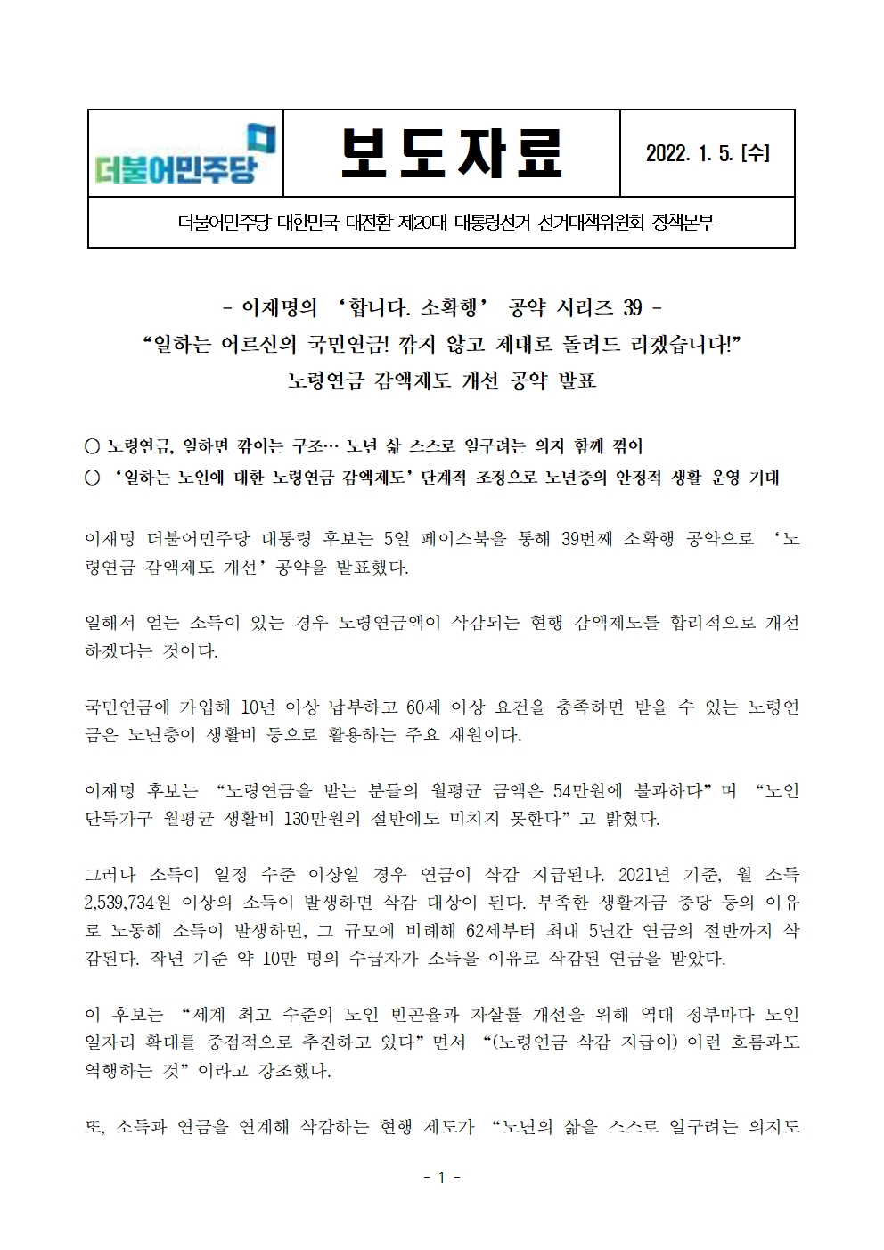 [보도자료] 더불어민주당 선대위 정책본부, '이재명은 합니다. 소확행 공약 시리즈 39' 노령연금 감액제도 개선 공약