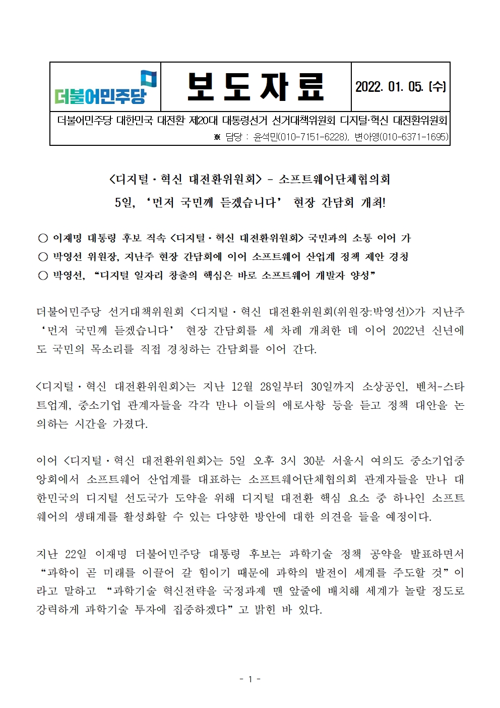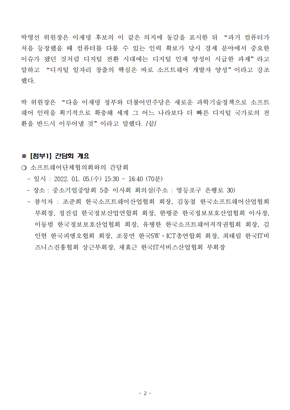 [보도자료] 더불어민주당 선대위 디지털·혁신 대전환위원회, 소프트웨어단체협의회와 현장 간담회 개최
