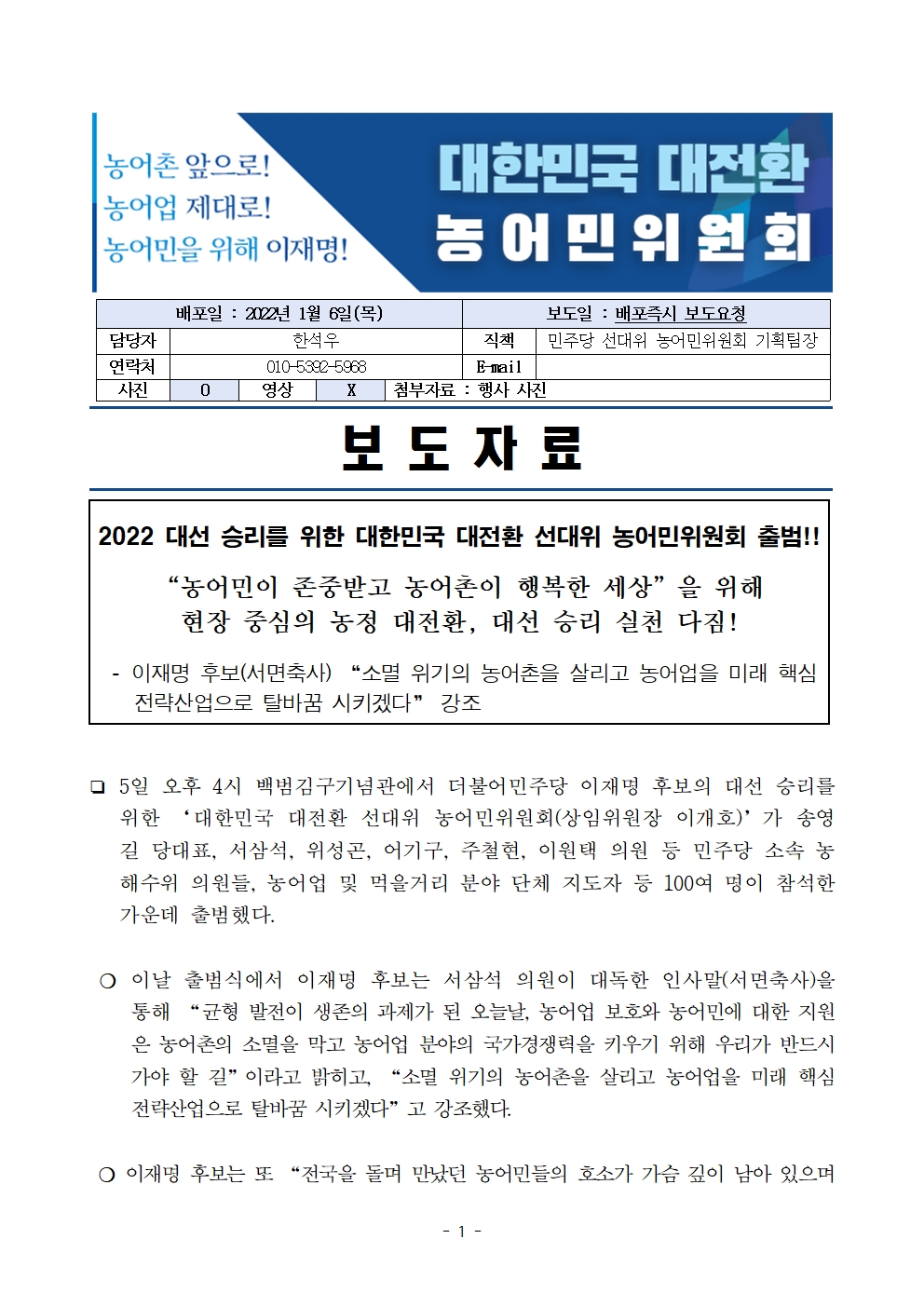 [보도자료] 더불어민주당 선대위 농어민위원회 출범