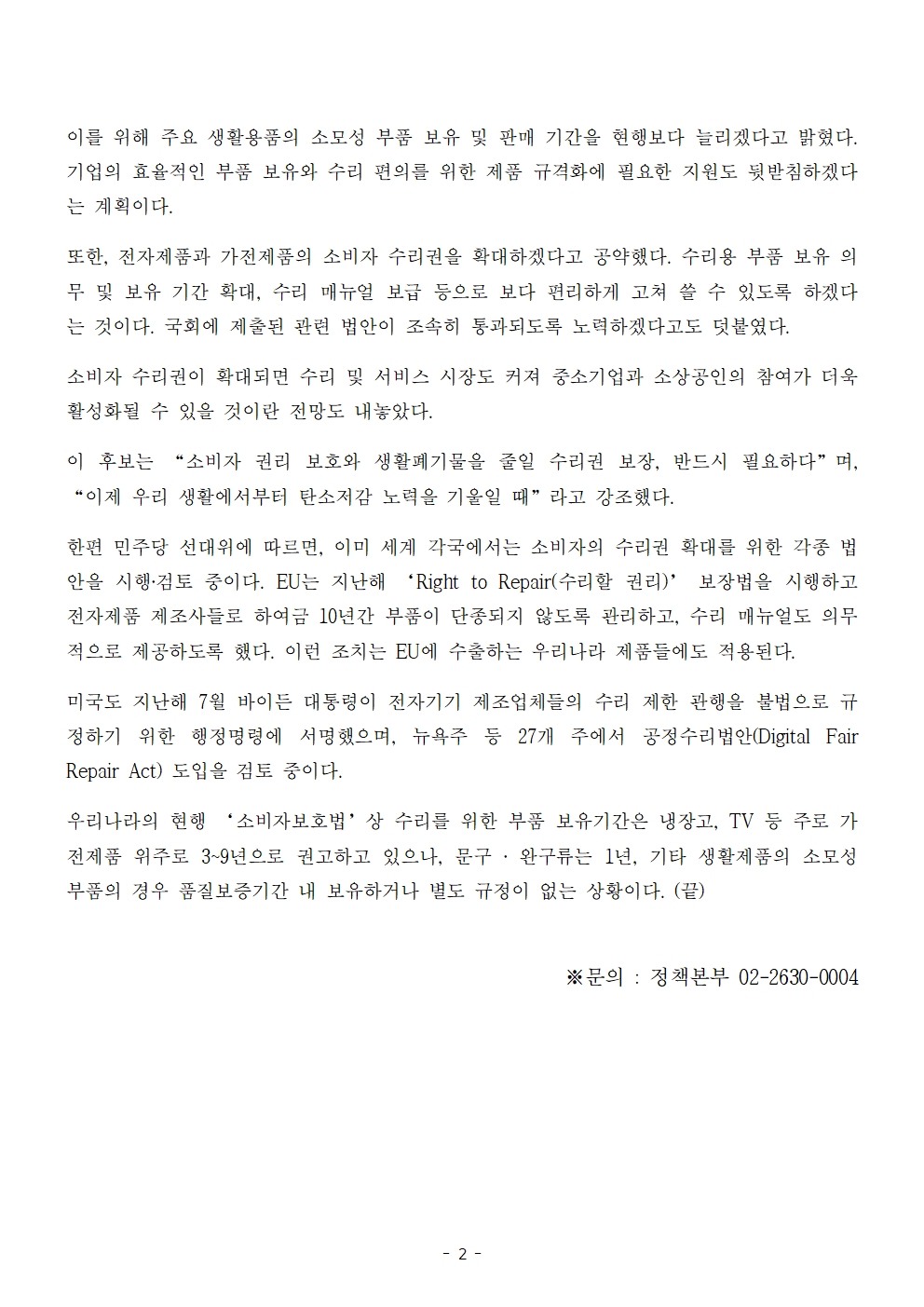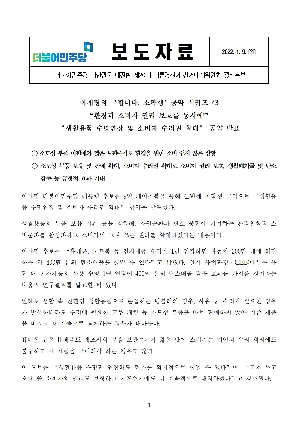 [보도자료] 더불어민주당 선대위 정책본부, '이재명의 합니다. 소확행 공약 시리즈 43' 생활용품 수명연장 및 소비자 수리권 확대