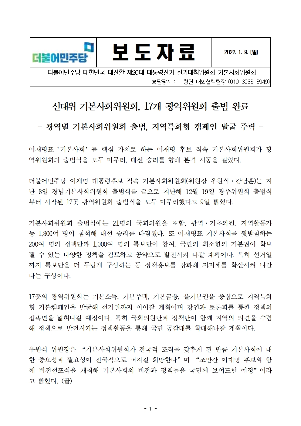 [보도자료] 더불어민주당 선대위 기본사회위원회, 17개 광역위원회 출범 완료