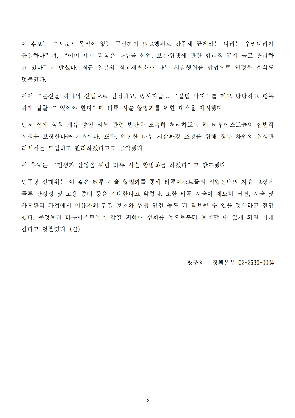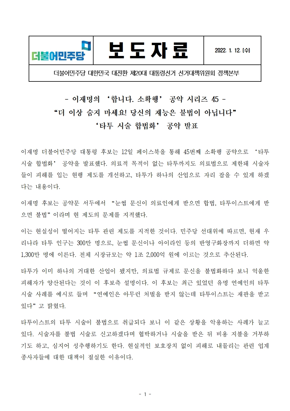 [보도자료] 더불어민주당 선대위 정책본부, '이재명은 합니다. 소확행 공약 시리즈 45' 타투 시술 합법화 공약