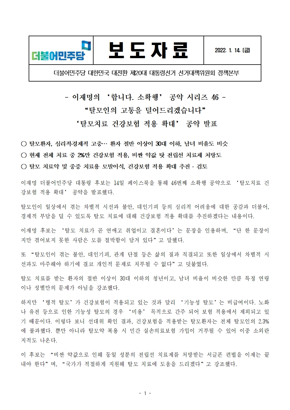 [보도자료] 더불어민주당 선대위 정책본부, '이재명은 합니다. 소확행 공약 시리즈 46' 탈모치료 건강보험 적용 확대 공약