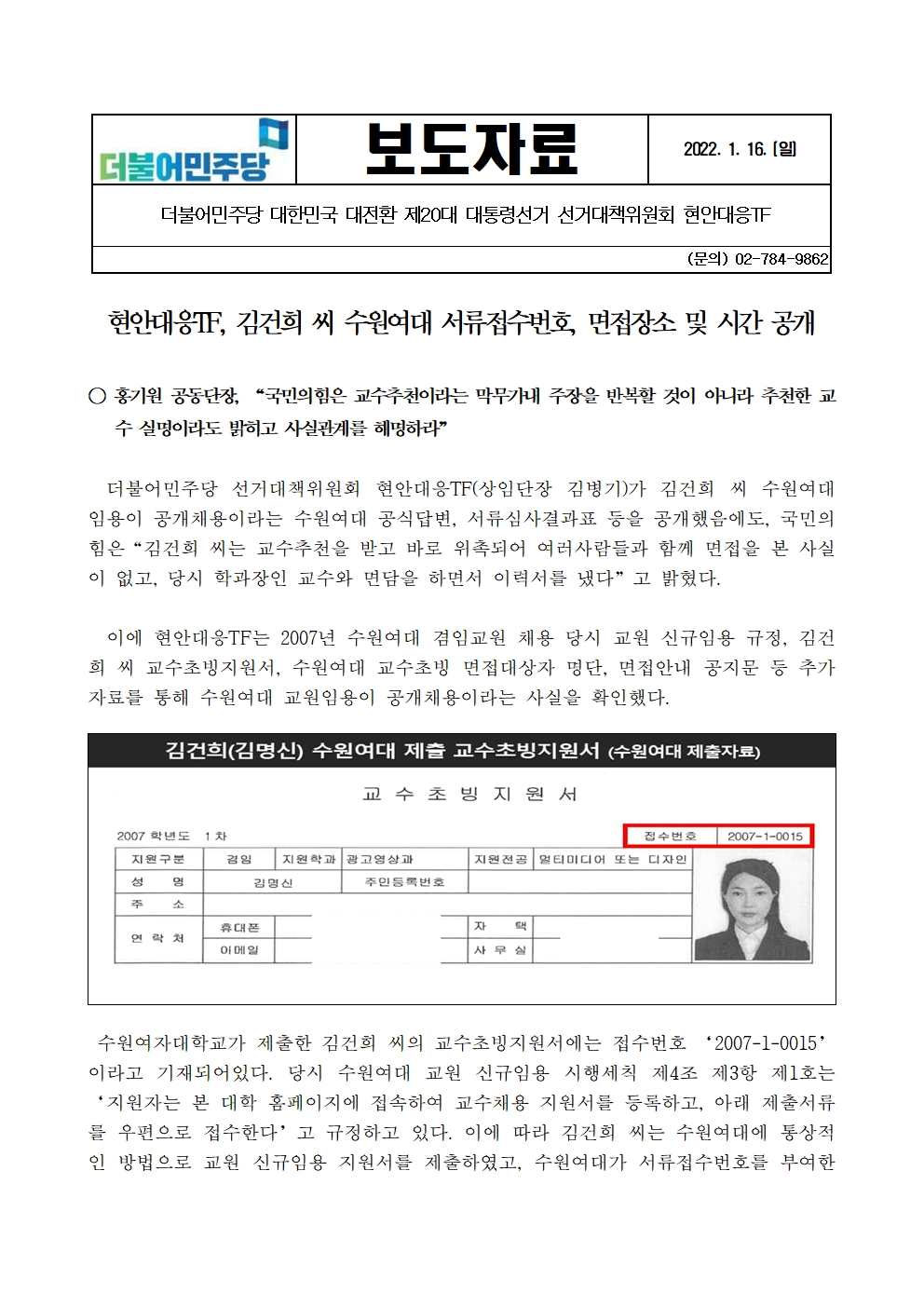 [보도자료] 더불어민주당 선대위 현안대응TF, 김건희 씨 수원여대 서류접수번호, 면접장소 및 시간 공개
