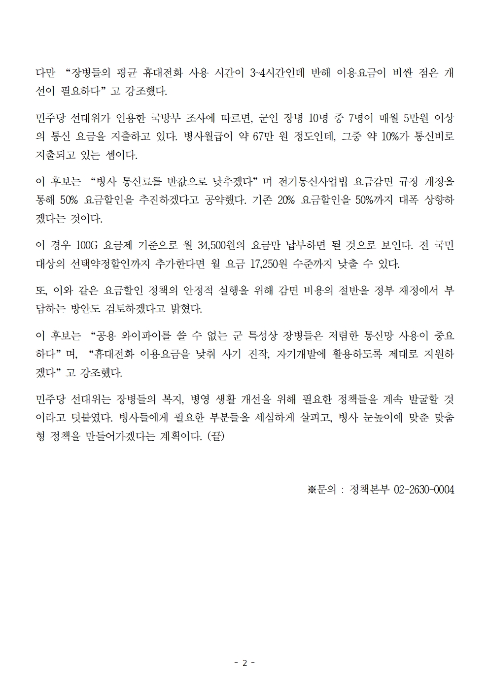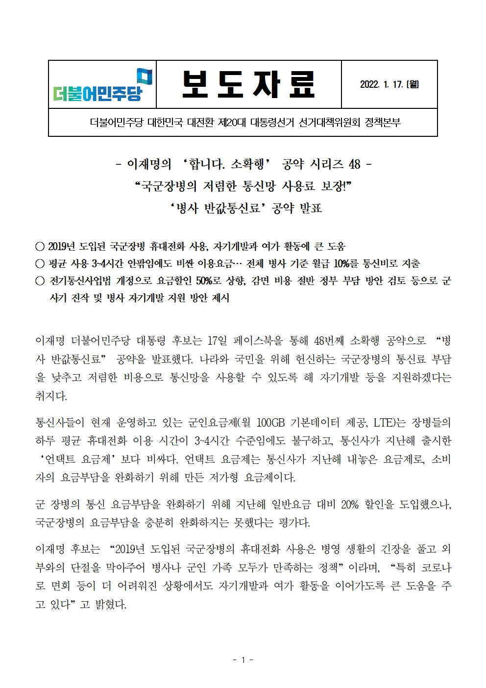 [보도자료] 더불어민주당 선대위 정책본부, '이재명은 합니다. 소확행 공약 시리즈 48' 병사 반값통신료 공약
