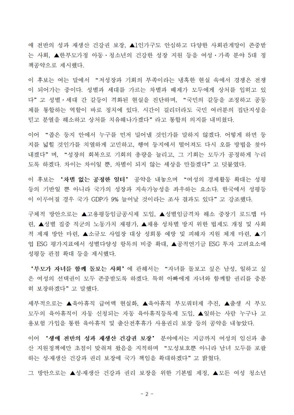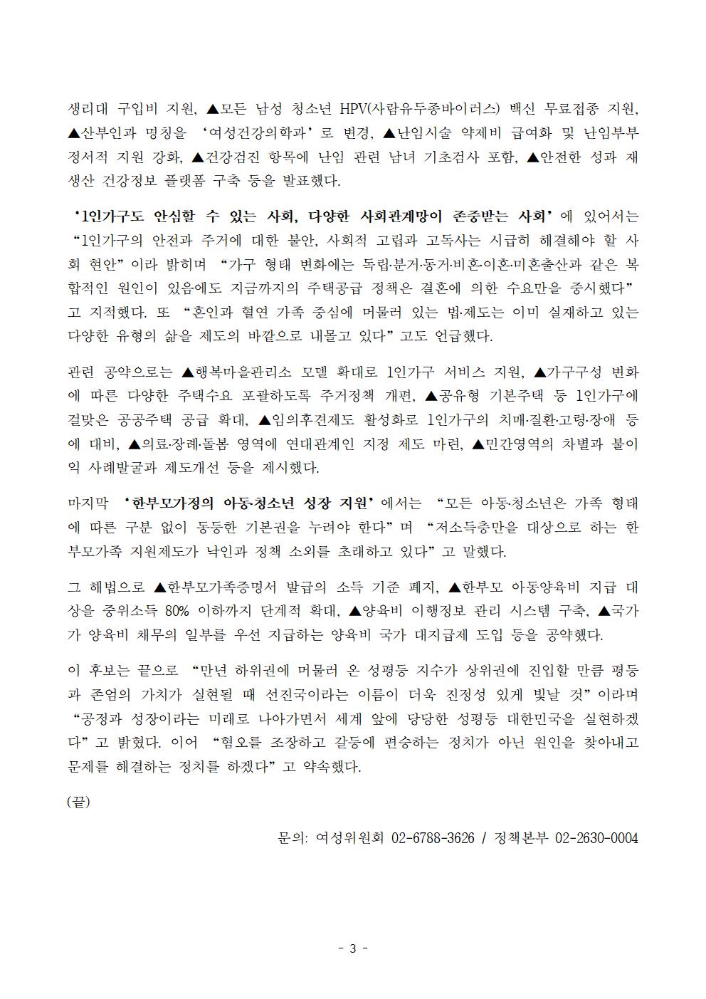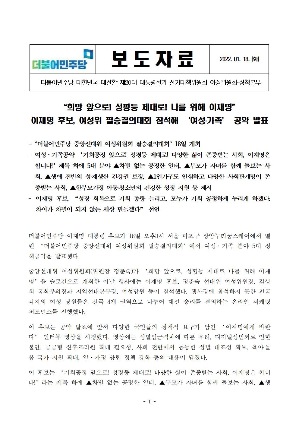 [보도자료] 더불어민주당 선대위 여성위원회, 정책본부 여성정책공약 발표
