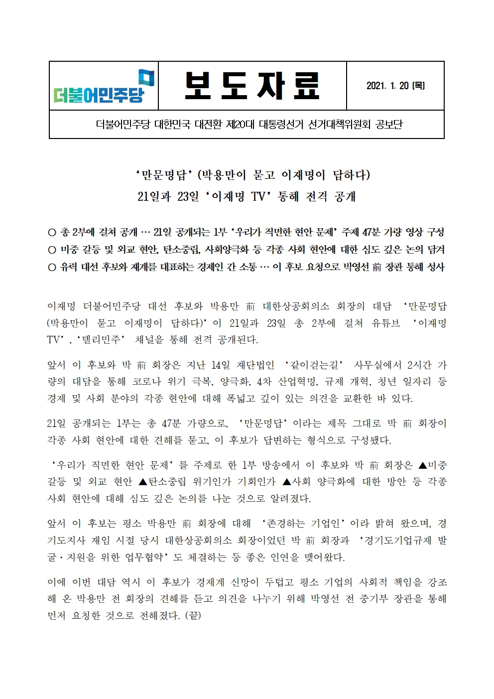 [보도자료] 더불어민주당 선대위 공보단, '만문명답' (박용만이 묻고 이재명이 답하다) 21일, 23일 전격 공개