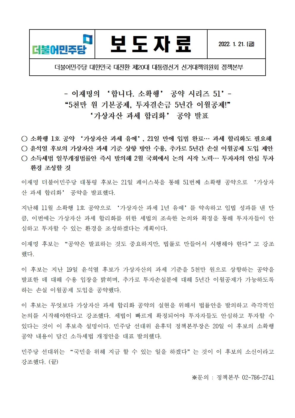 [보도자료] 더불어민주당 선대위 정책본부, '이재명은 합니다. 소확행 공약 시리즈 51' 가상자산 과세 합리화 공약