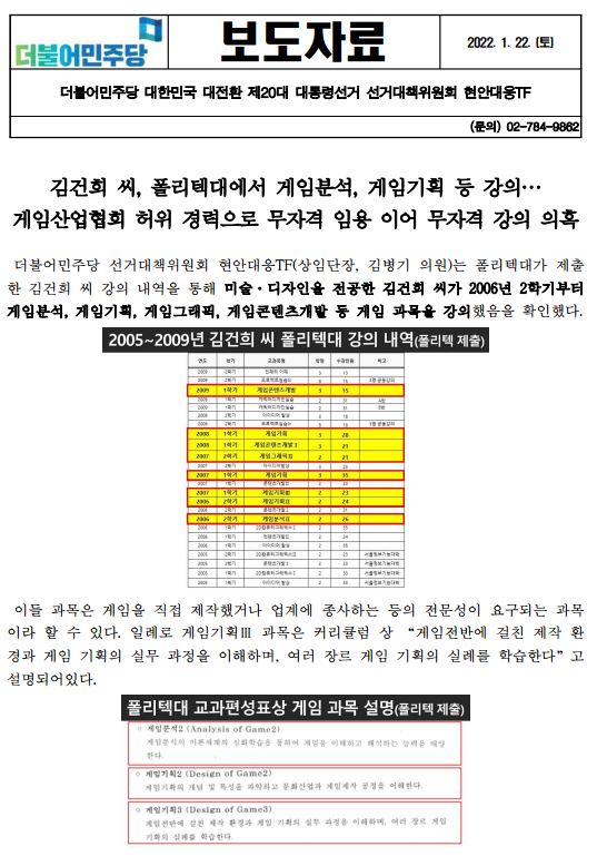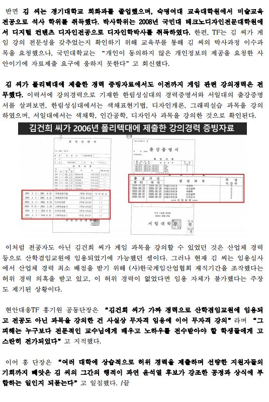 [보도자료] 김건희 씨, 폴리텍대에서 게임산업협회 허위 경력으로 무자격 임용 이어 무자격 강의 의혹