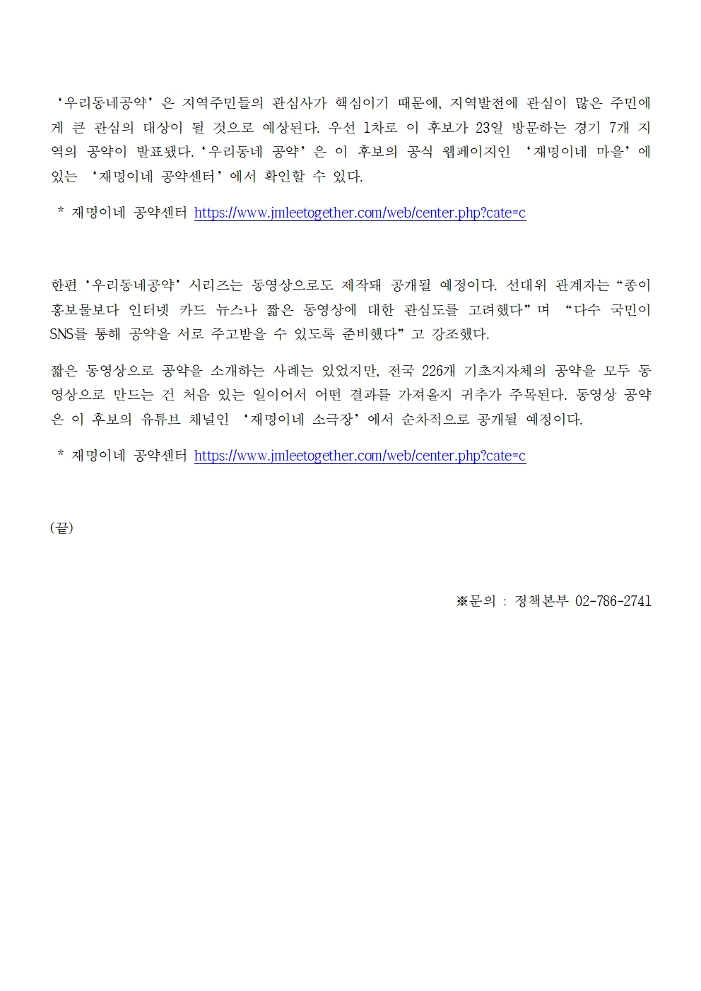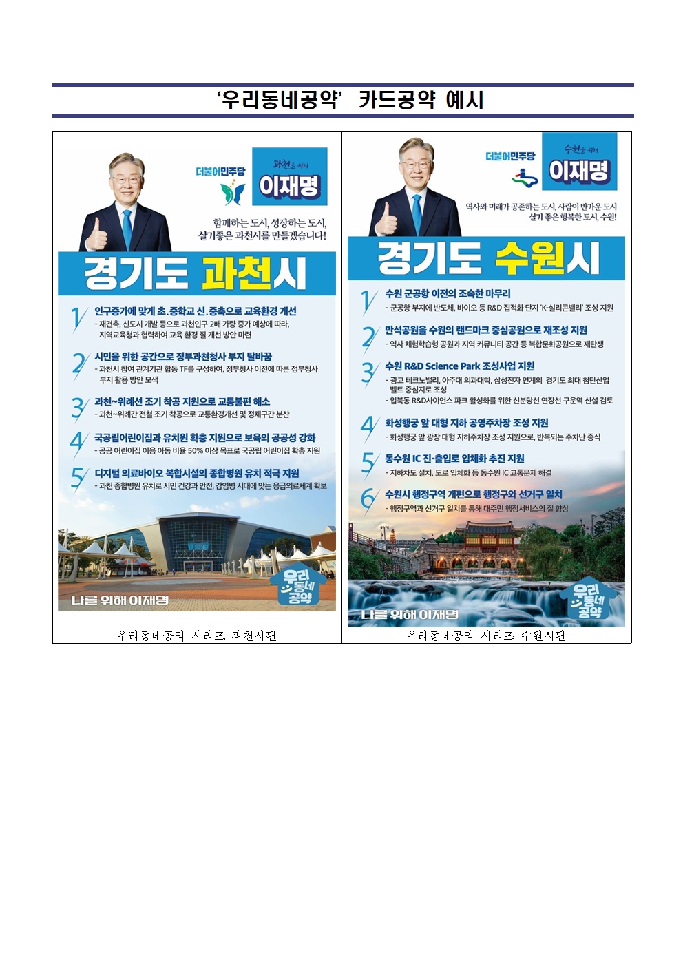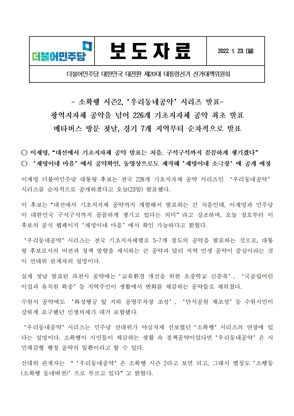 [보도자료] 더불어민주당 선대위 정책본부, 소확행 시즌2 '우리동네공약' 시리즈 발표